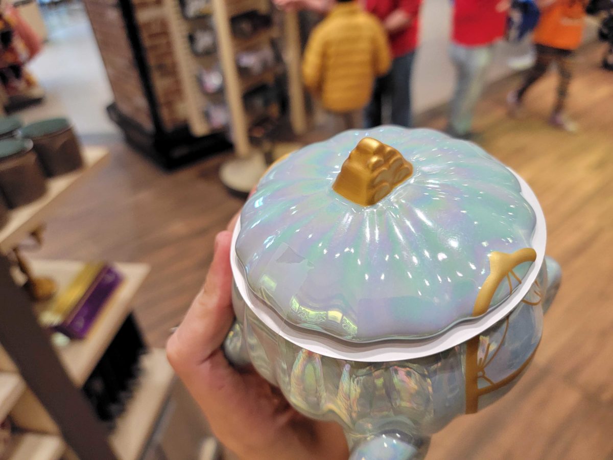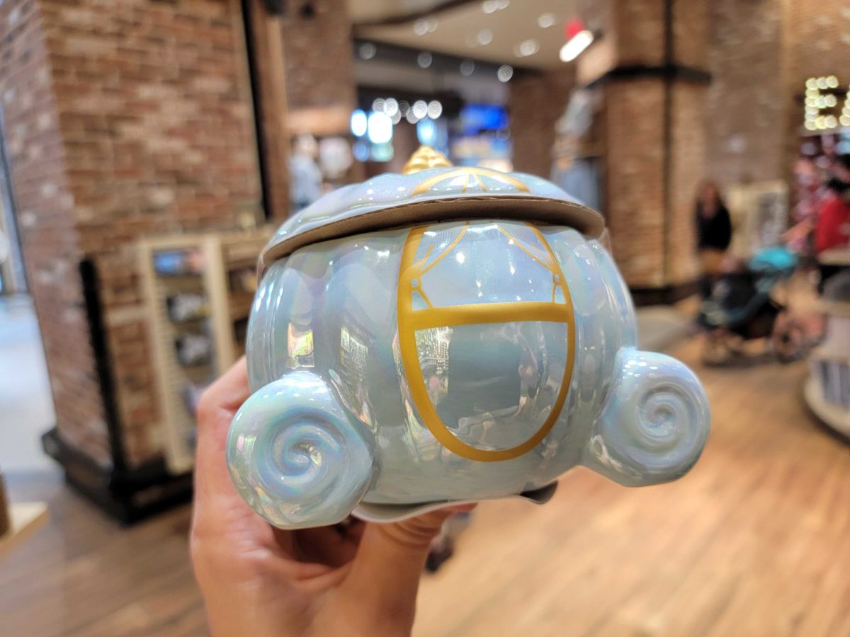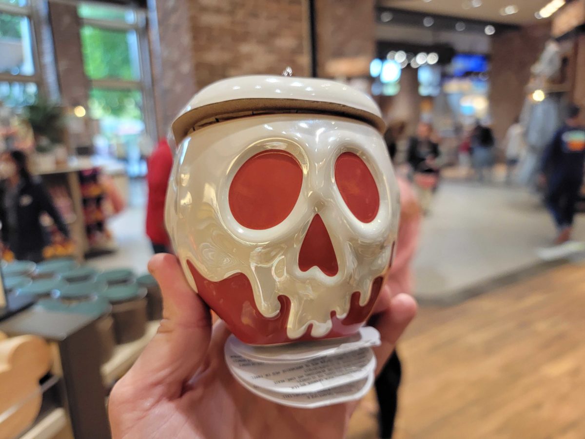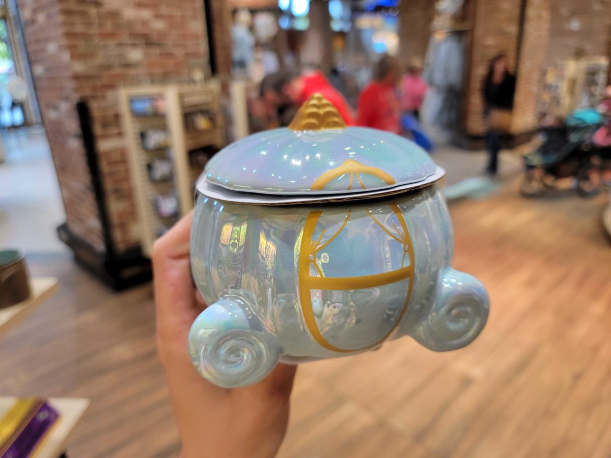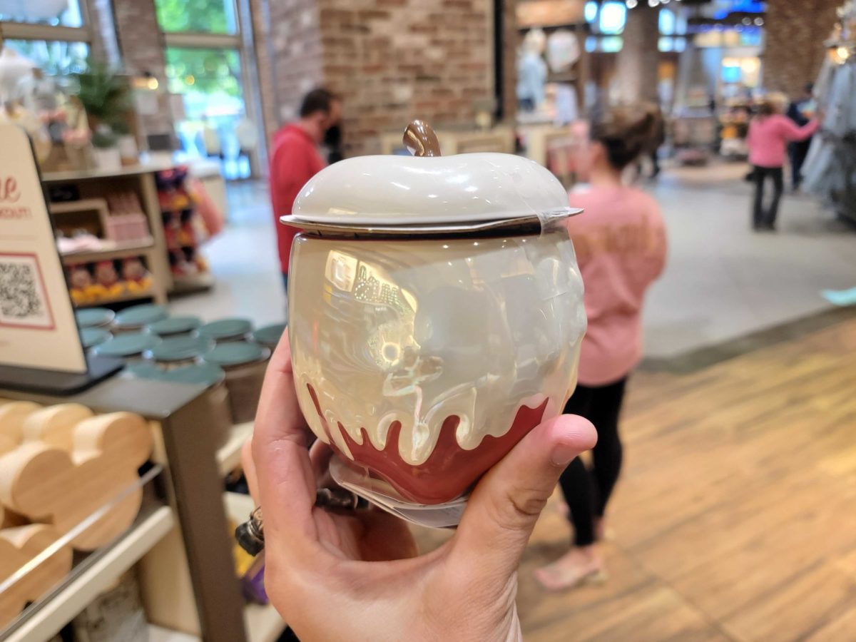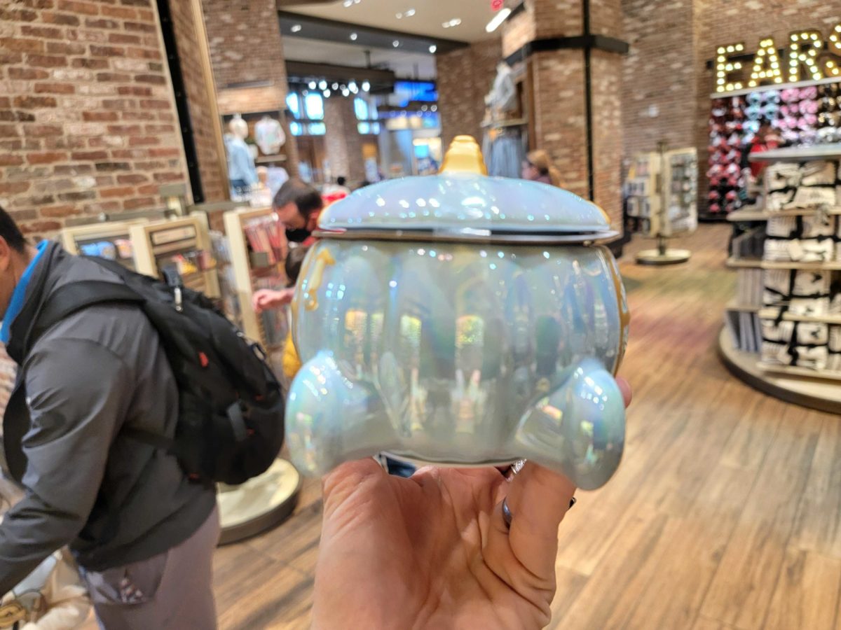 It is shaped like Mickey’s head, with a ceramic bottom and wood finish lid.
