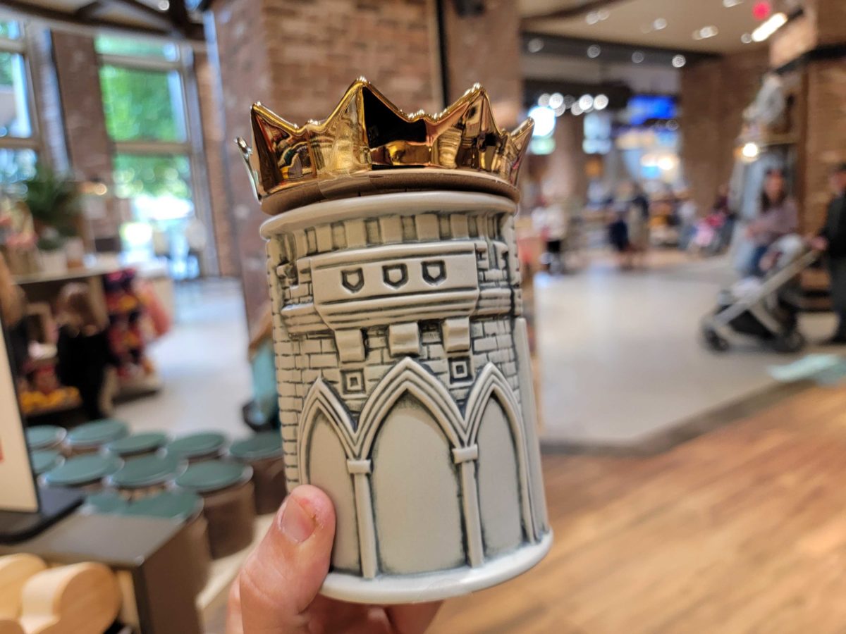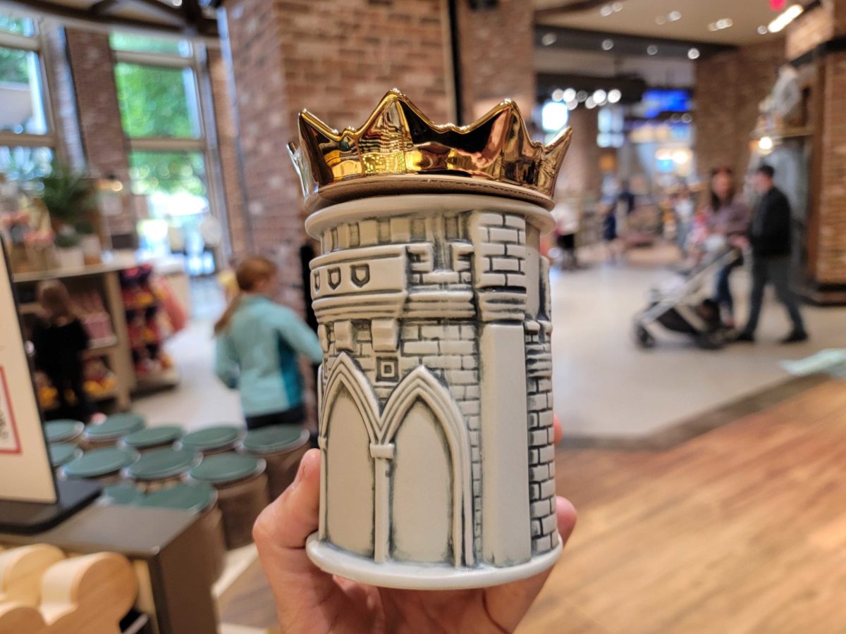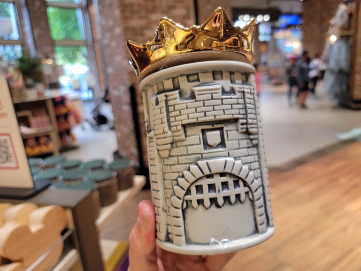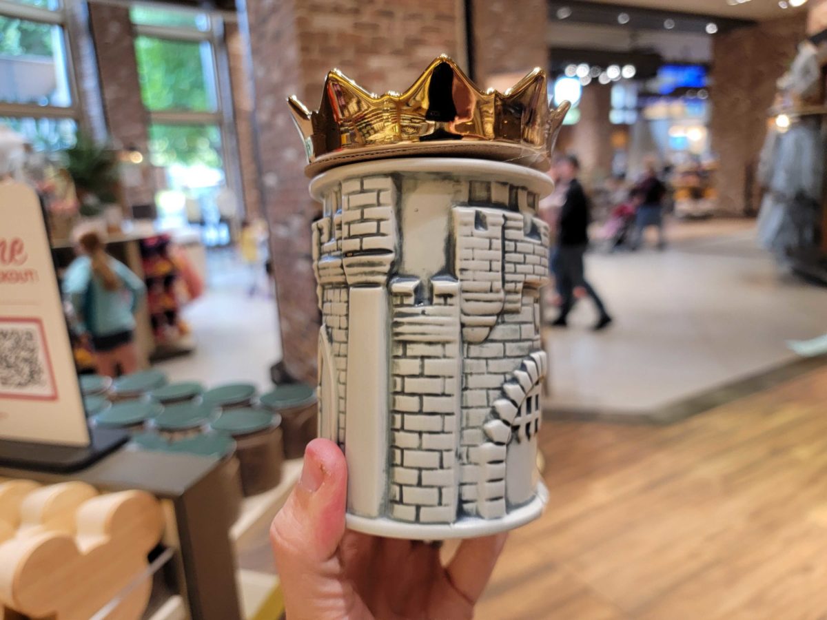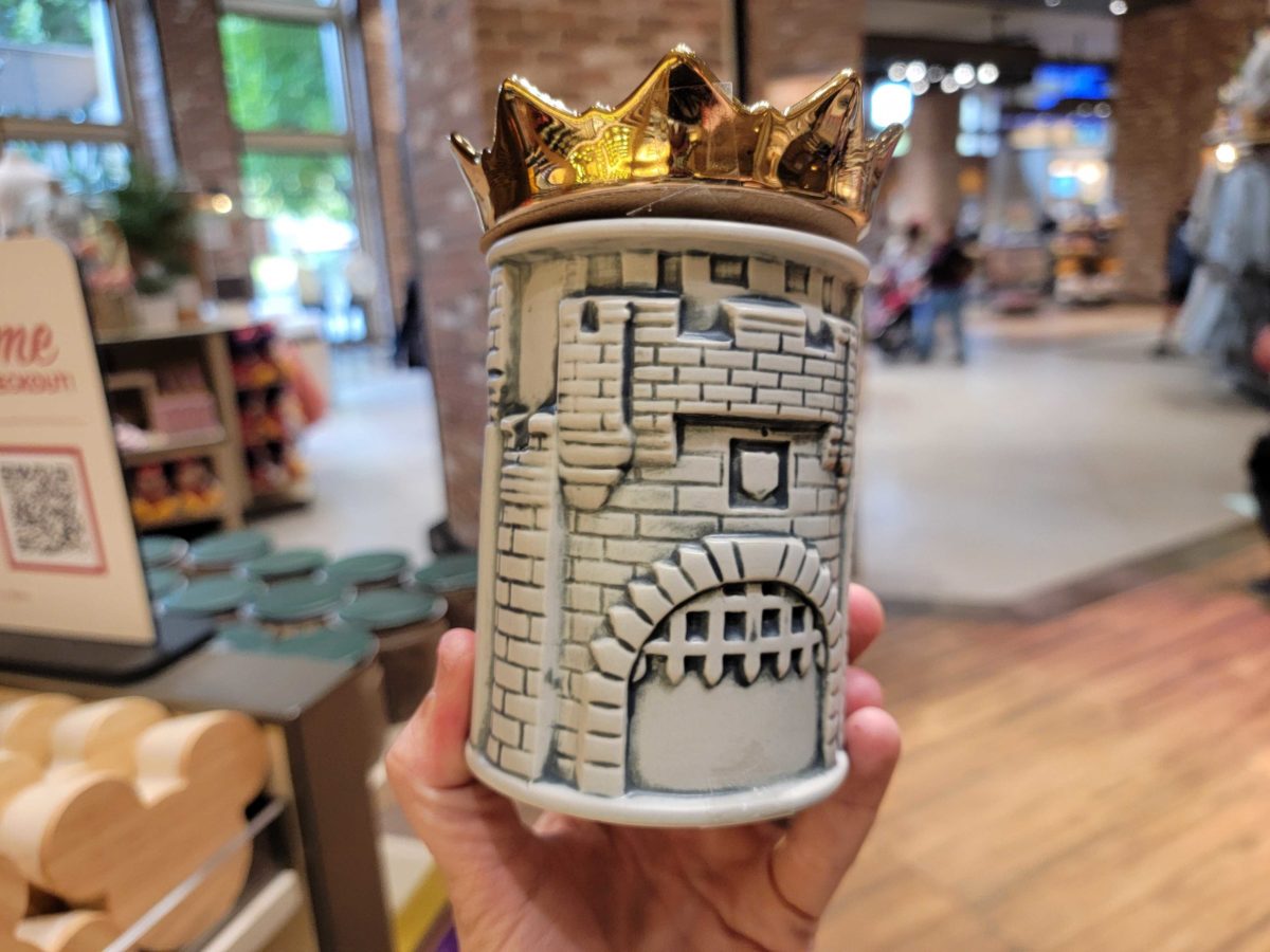 This candle holder is shaped like a castle tower with a golden crown on top.