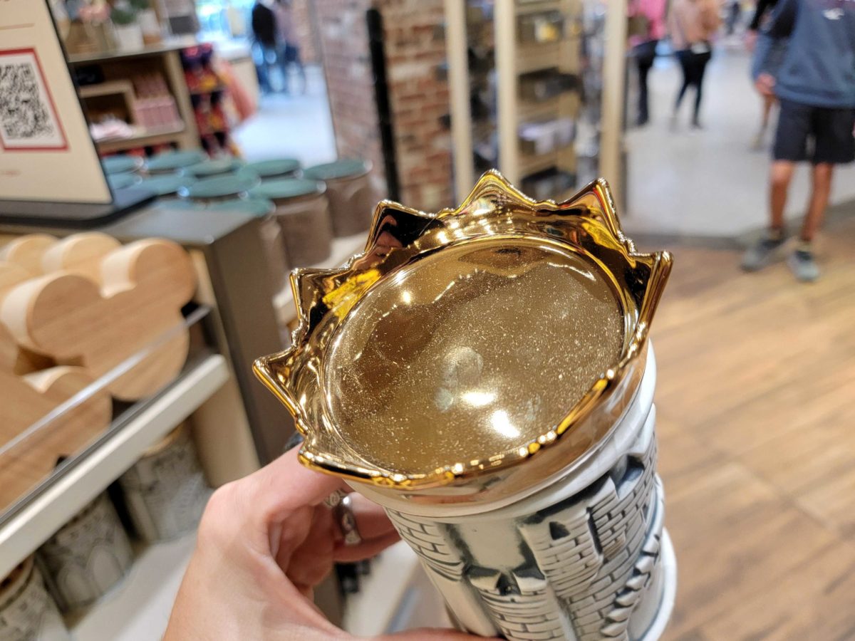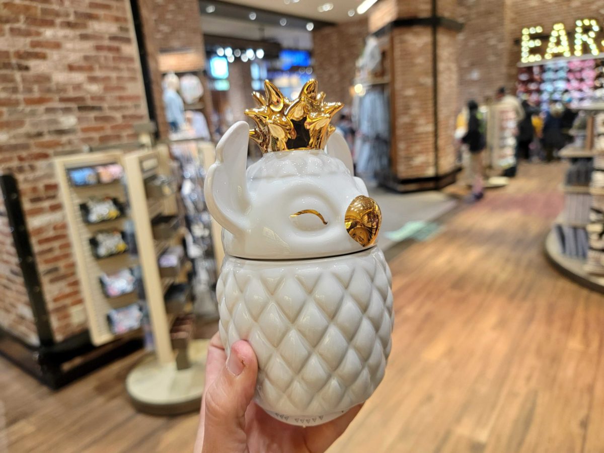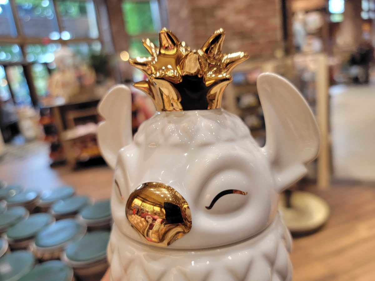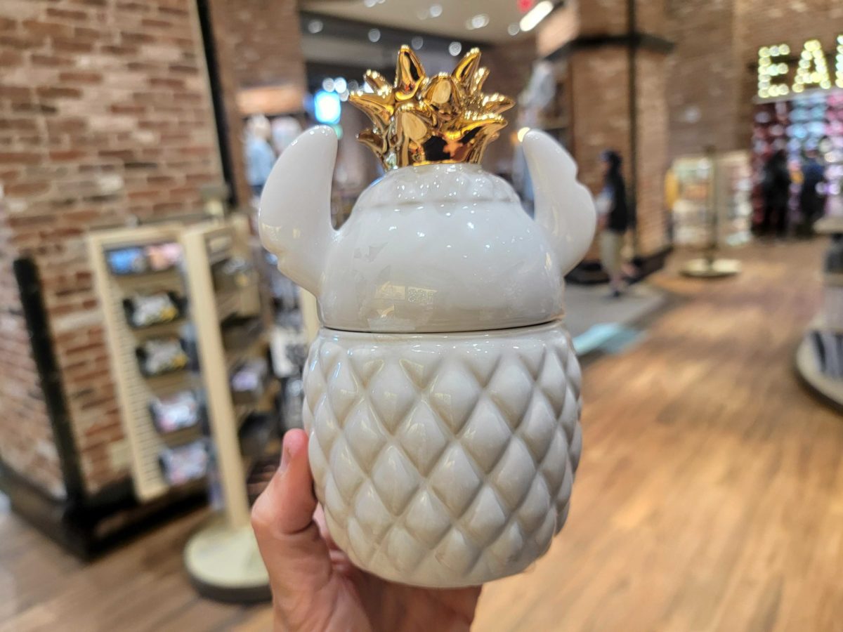It is white with gold touches. The lid is shaped like Stitch’s head.