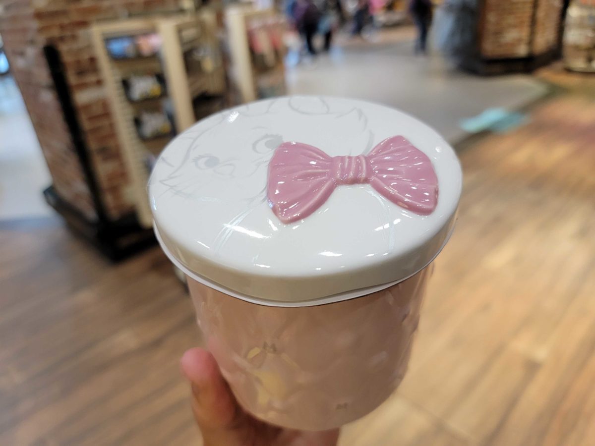 The Marie candle comes in a pink holder with a white lid featuring Marie’s outline and pink bow.