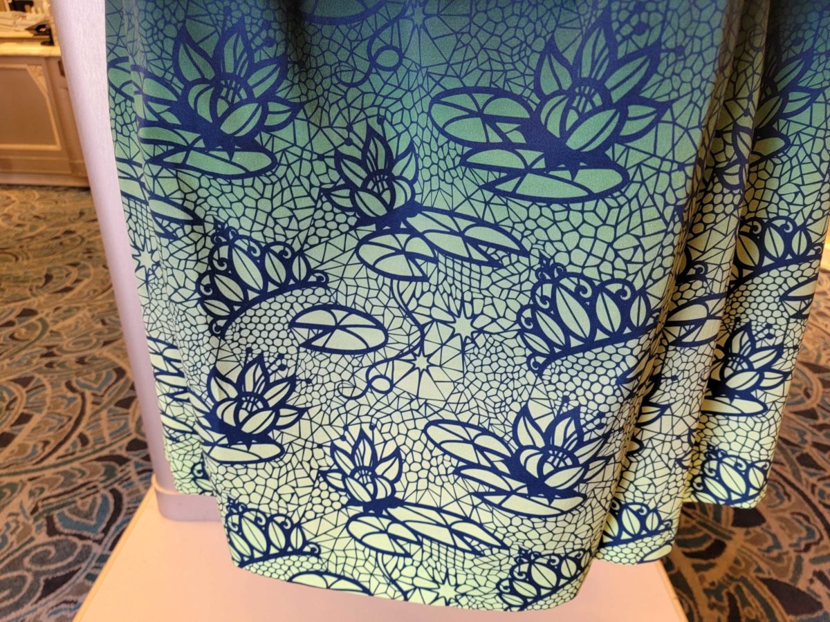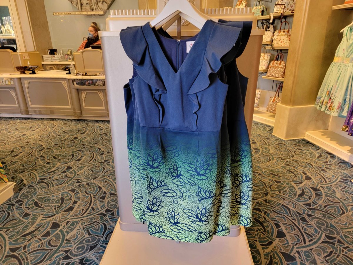 The dress is mid-length and fitted, with flutter-wing sleeves, a v-neck, and a lily-pad print skirt. The business-casual silhouette befits Tiana’s entrepreneurial spirit.