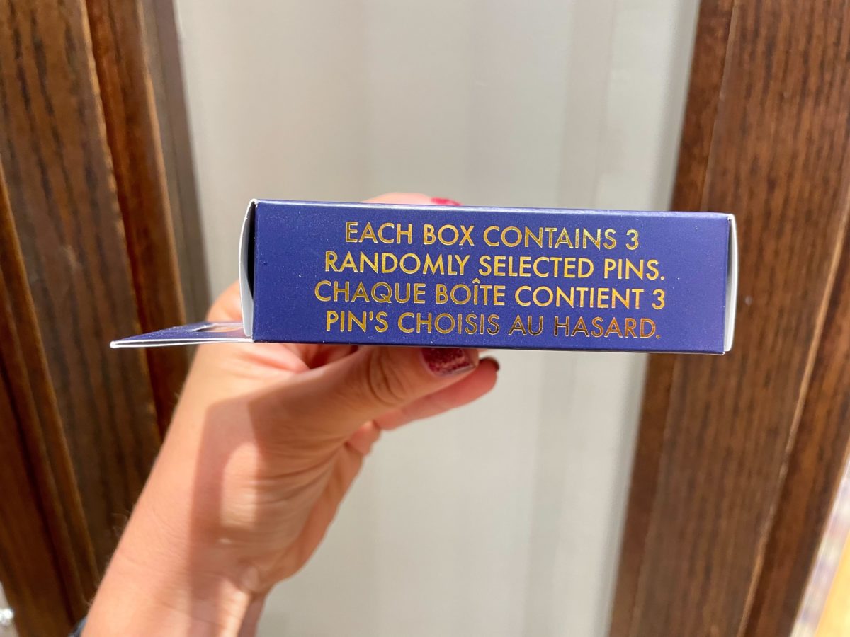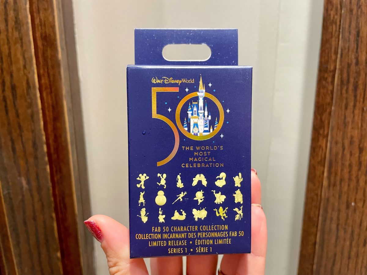 The pins come in these blue boxes with the Walt Disney World 50th Anniversary logo on the front.