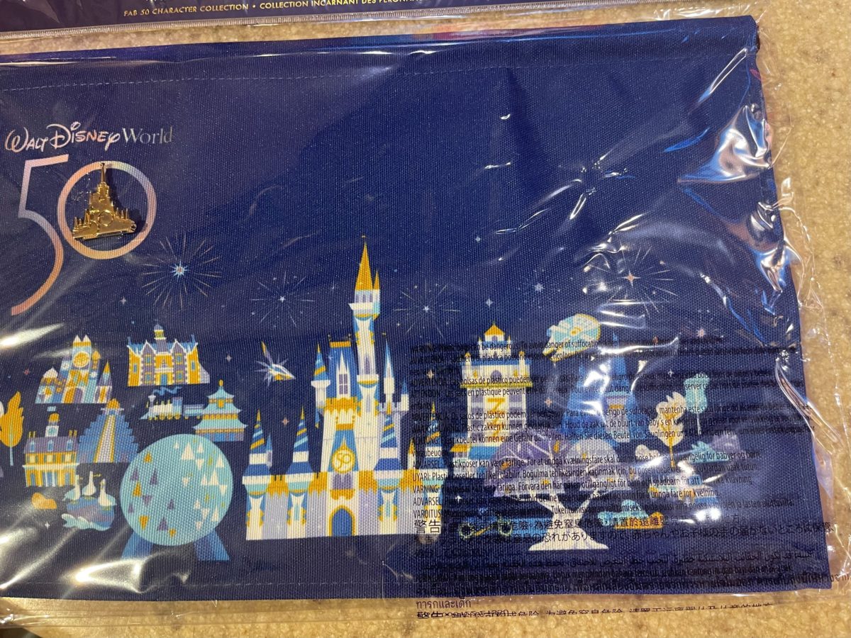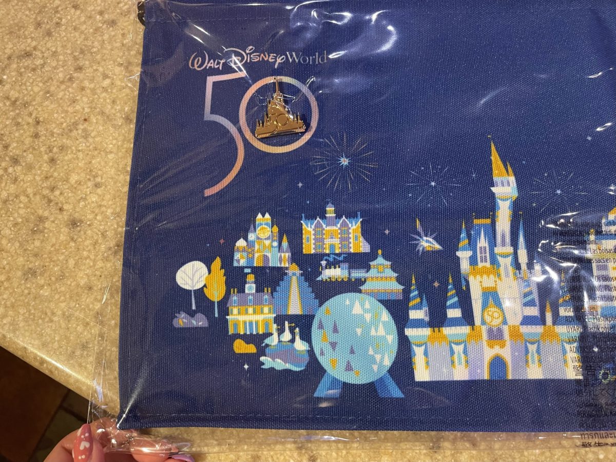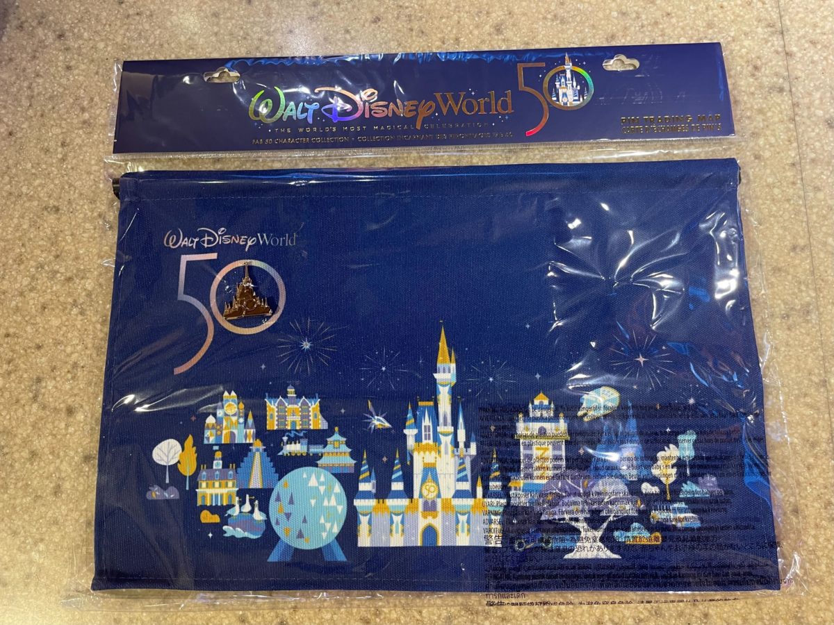 The “map” features iconic buildings from across Walt Disney World, like much of the 50th Anniversary merchandise. Sights include the four park icons of course, as well as The Hall of Presidents, the Millennium Falcon, the Walt Disney World Railroad, and more. A small gold pin with Cinderella Castle and the 50 logo are also included as part of the mat.