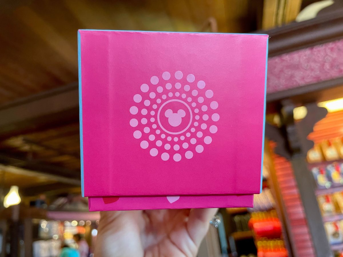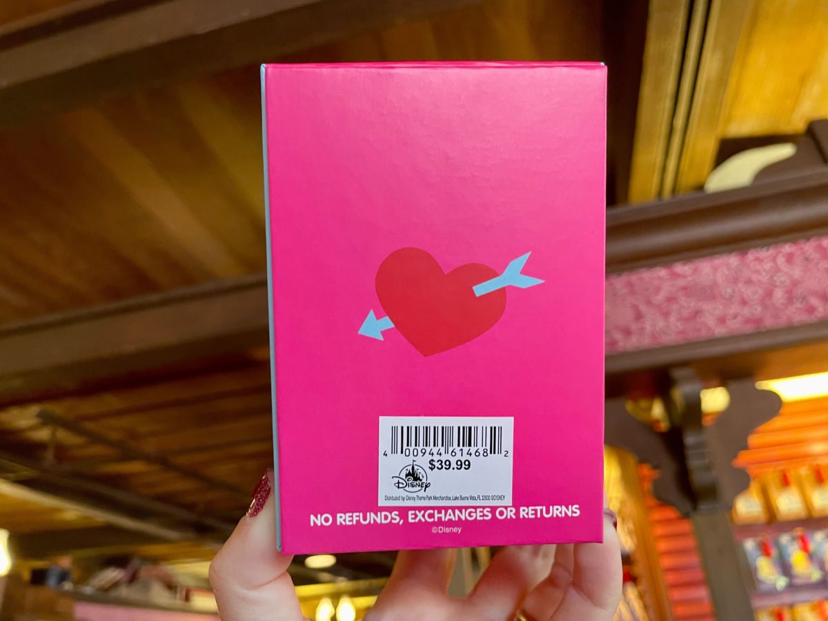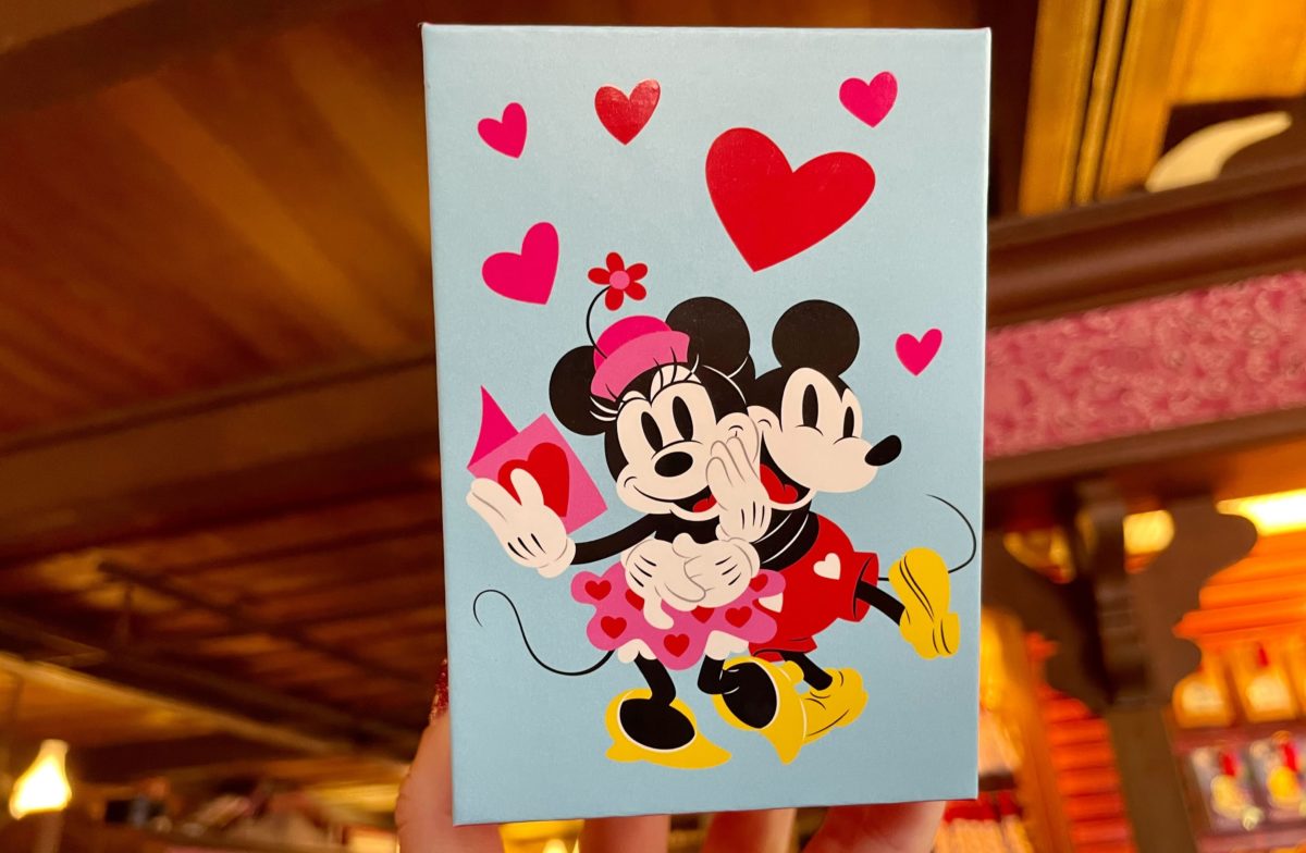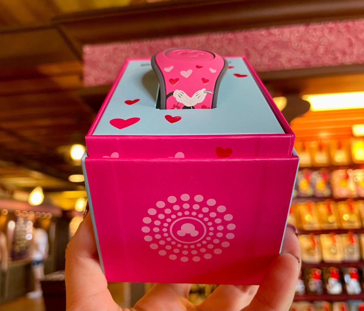 The MagicBand comes in a box that features Mickey and Minnie embracing. Minnie’s holding a Valentine and hearts are above them.