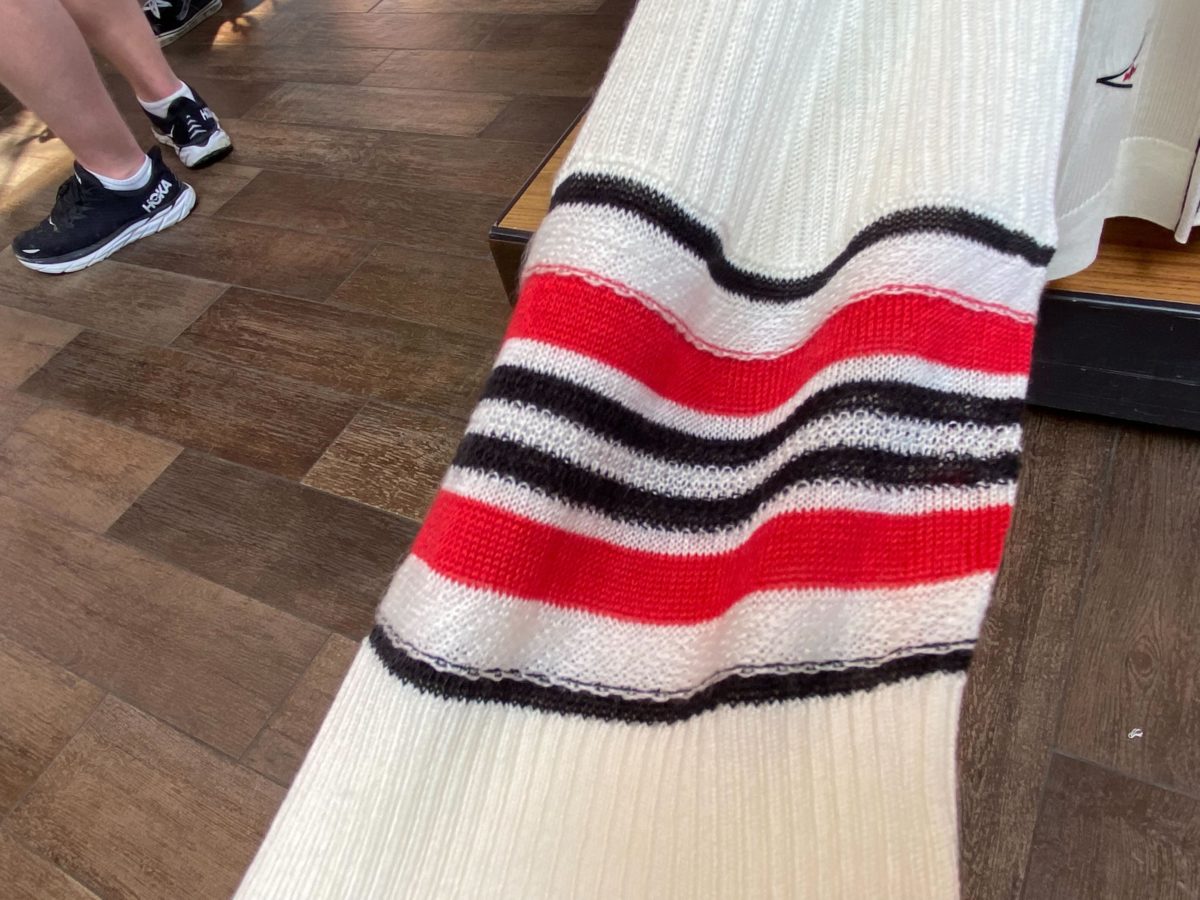This off-white cardigan has black and red striped detailing around the collar, buttons, and sleeves.