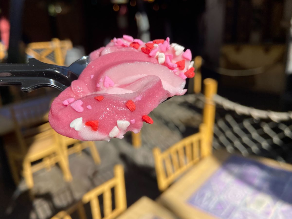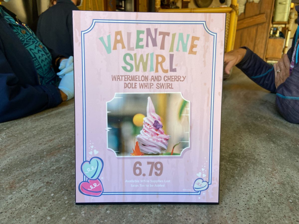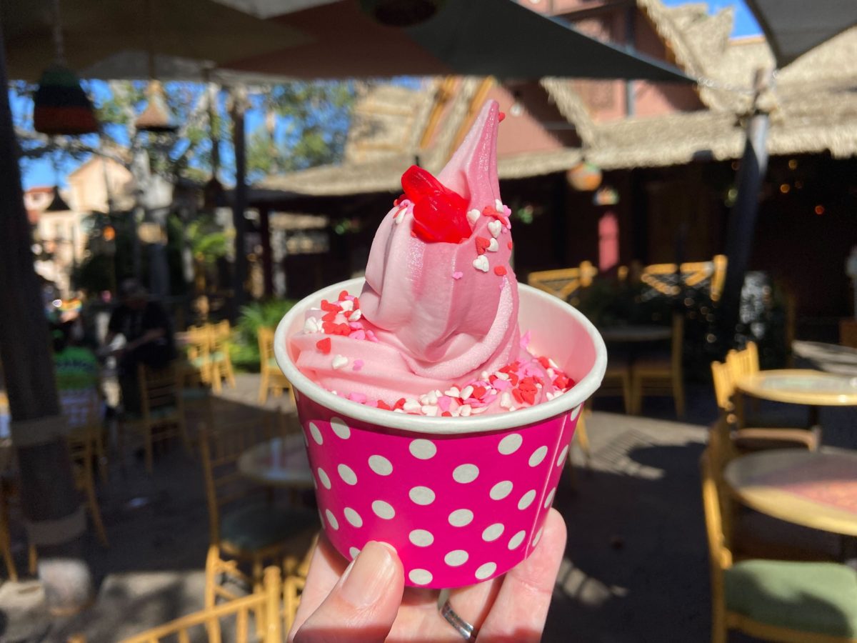 We’re trying some of the tasty new treats around Disneyland for Valentine’s season, and who doesn’t love new Dole Whip flavors? Tropical Hideaway is serving a Valentine Swirl for your sweetheart.