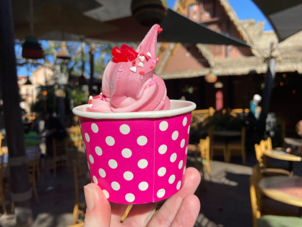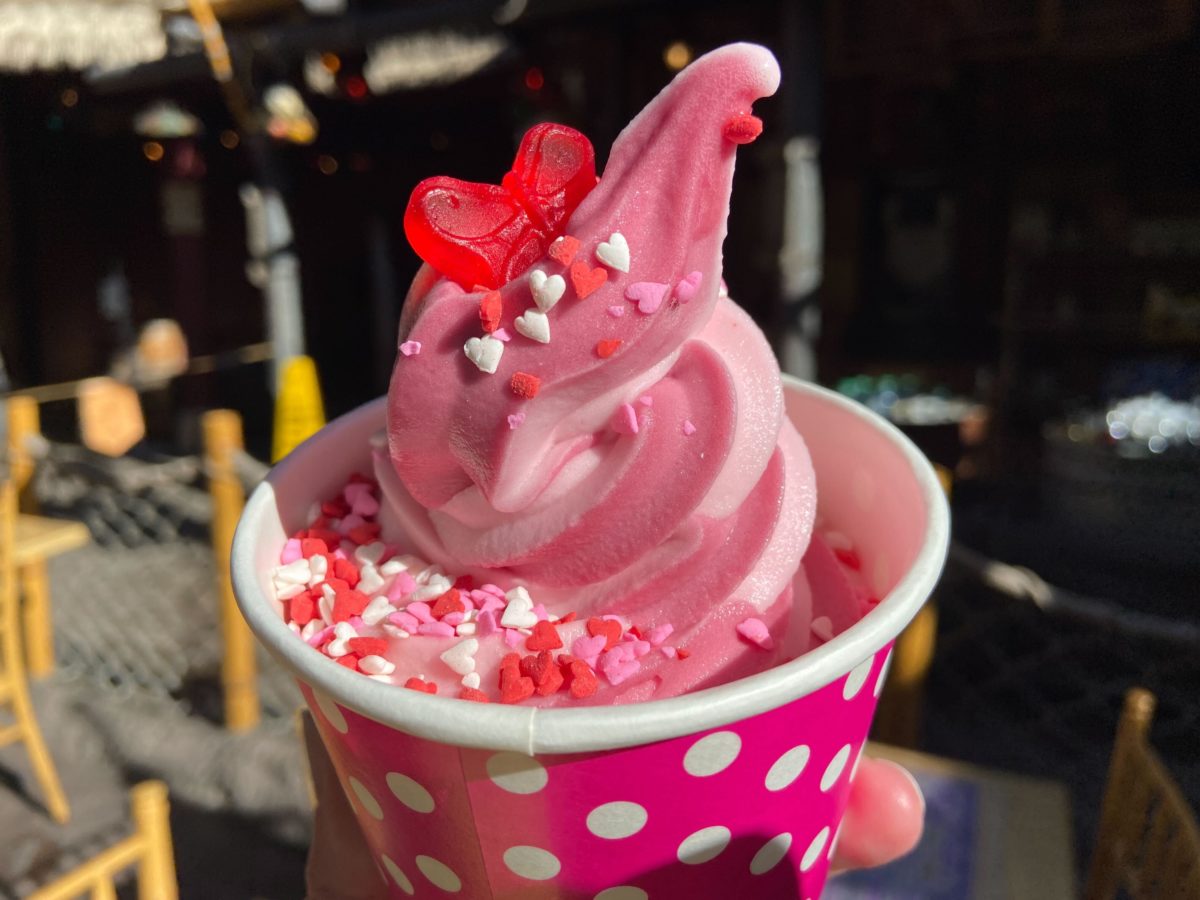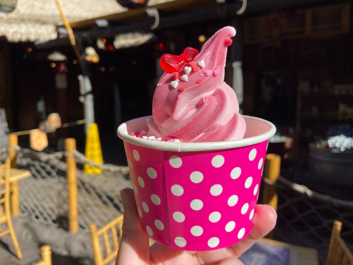 We’re trying some of the tasty new treats around Disneyland for Valentine’s season, and who doesn’t love new Dole Whip flavors? Tropical Hideaway is serving a Valentine Swirl for your sweetheart.