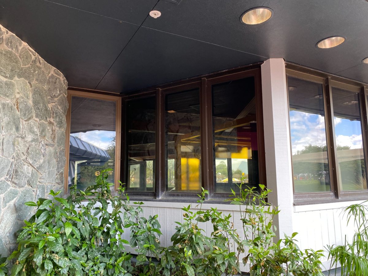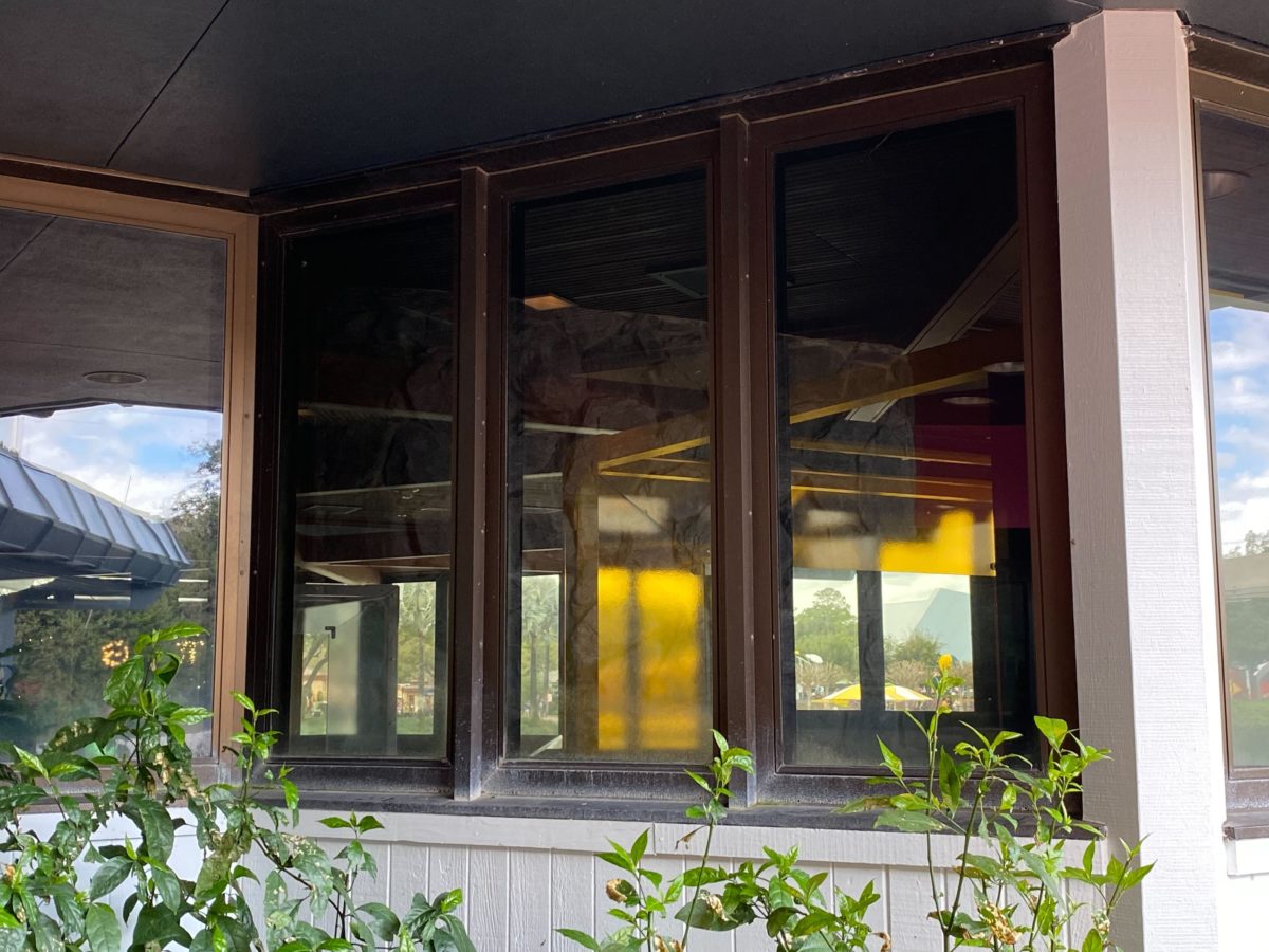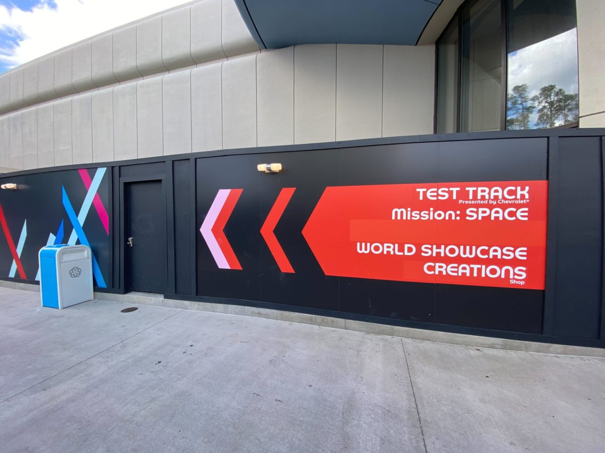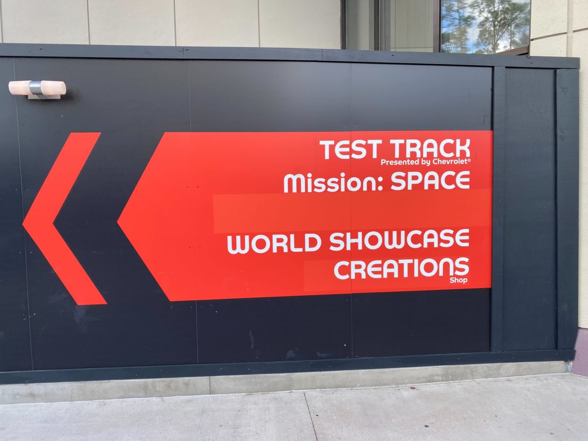 This sign for the EPCOT Experience is now covered in grey scrim.