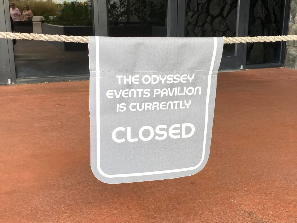 A sign hanging from the rope reads “The Odyssey Events Pavilion is currently closed.”