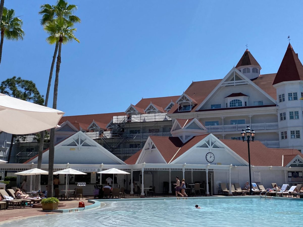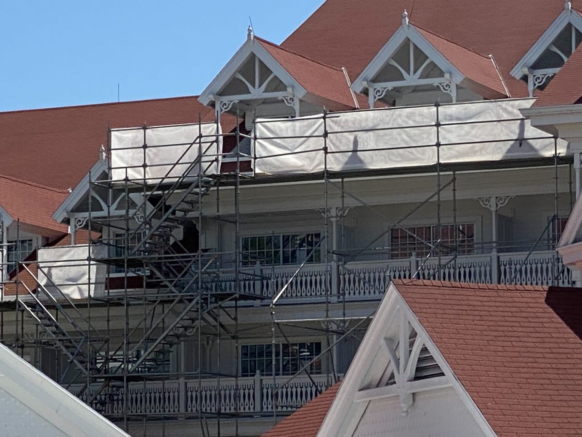 From the pool area, we could see more scaffolding and tarps on the side of the building.
