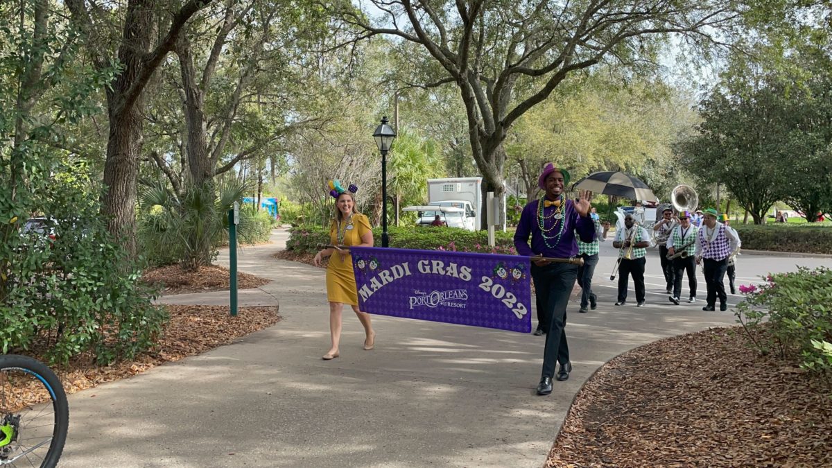 Cast Members led the parade with a Mardi Gras 2022 banner.