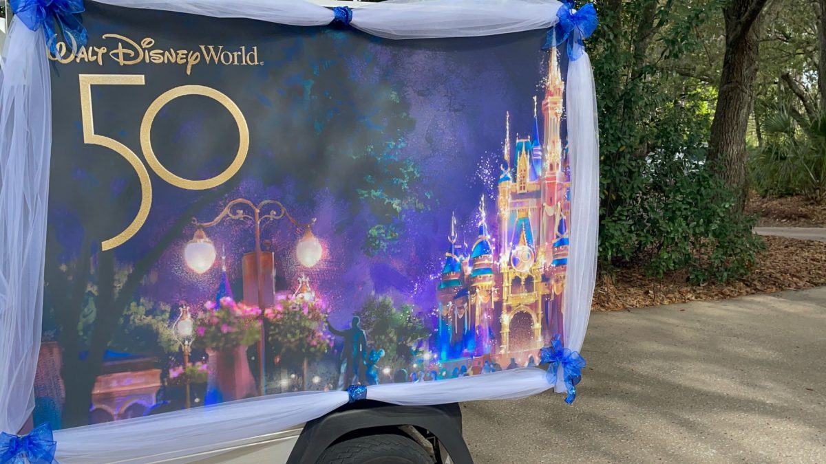 This float celebrated the 50th anniversary of Walt Disney World with white tulle and 50th anniversary signs.