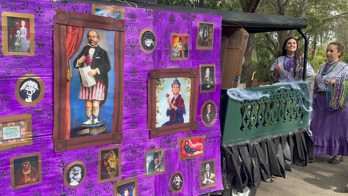 The Cast Members with each “float” dressed up, too. After the Enchanted Tiki Room cart was a Haunted Mansion group wearing purple and black.