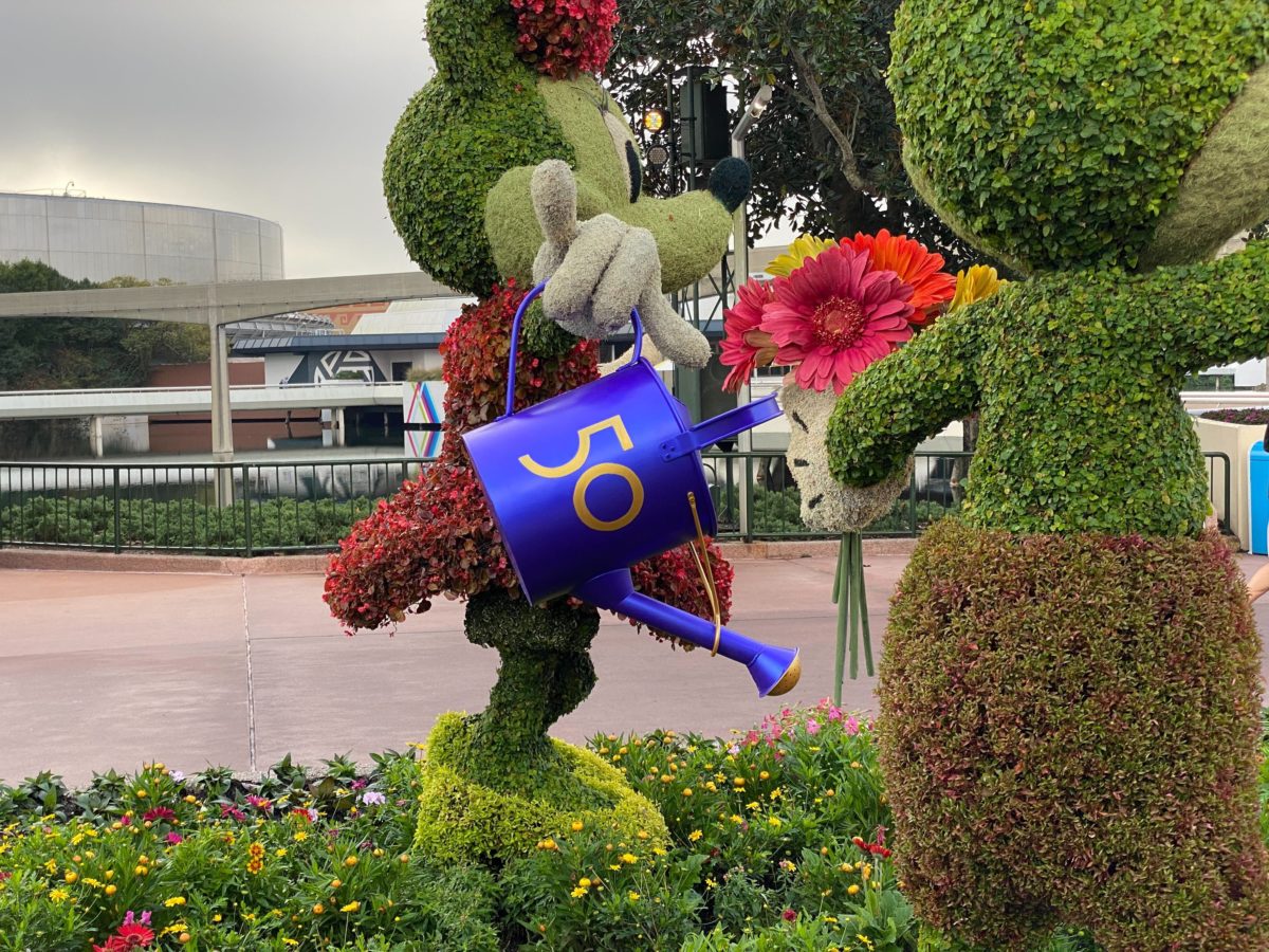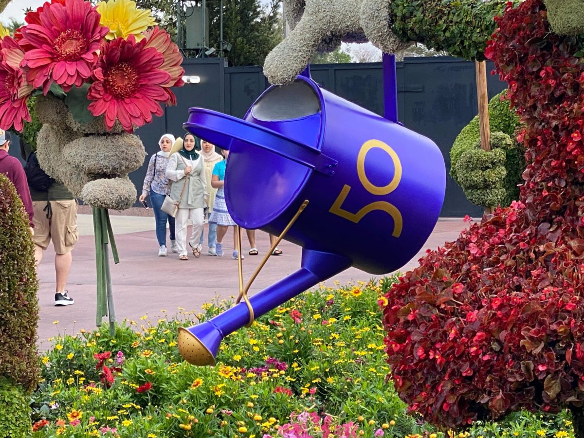 The Minnie Mouse topiary at the 2022 EPCOT International Flower & Garden Festival is now holding a 50th anniversary watering can.