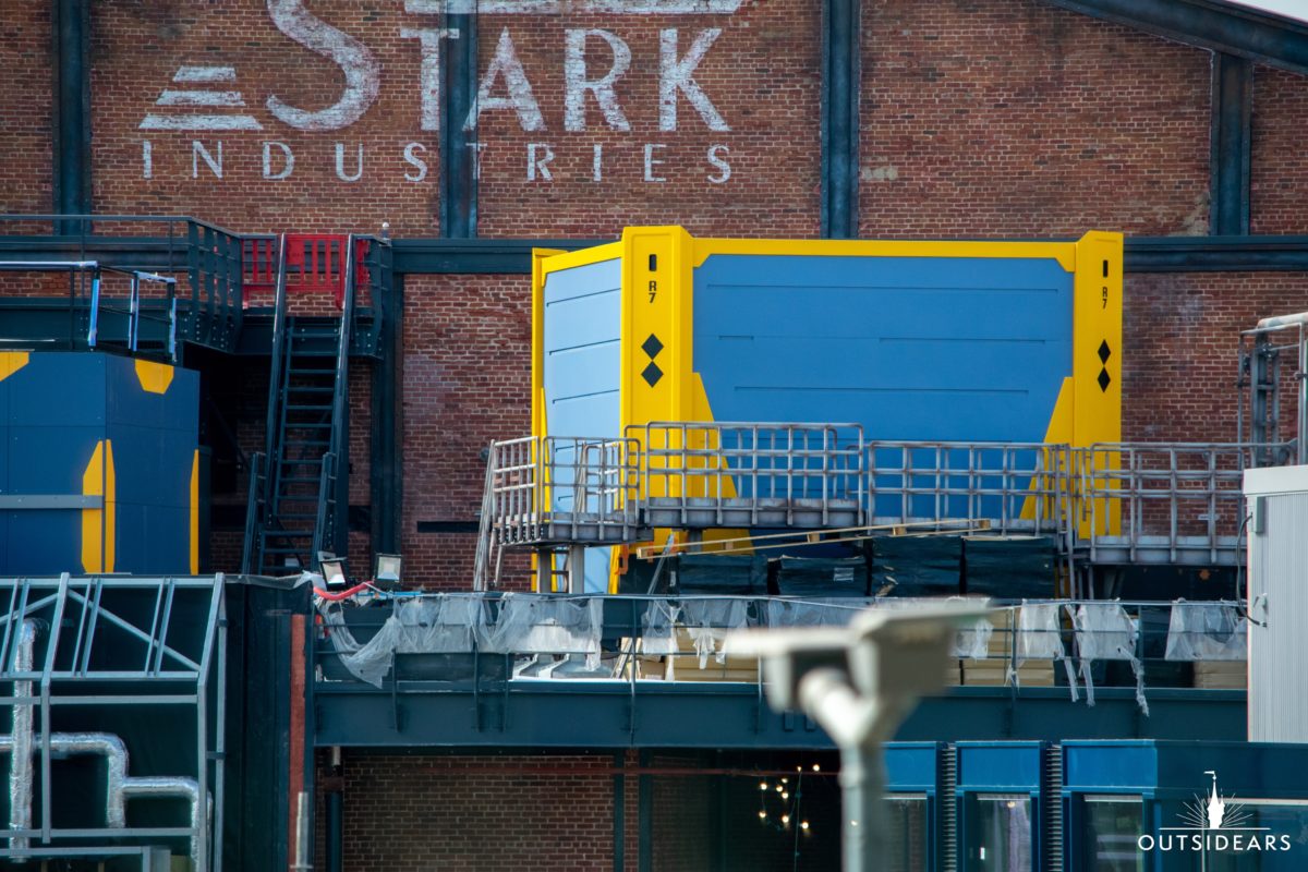 Yellow and blue box structures sit outside the Stark Industries brick façade.