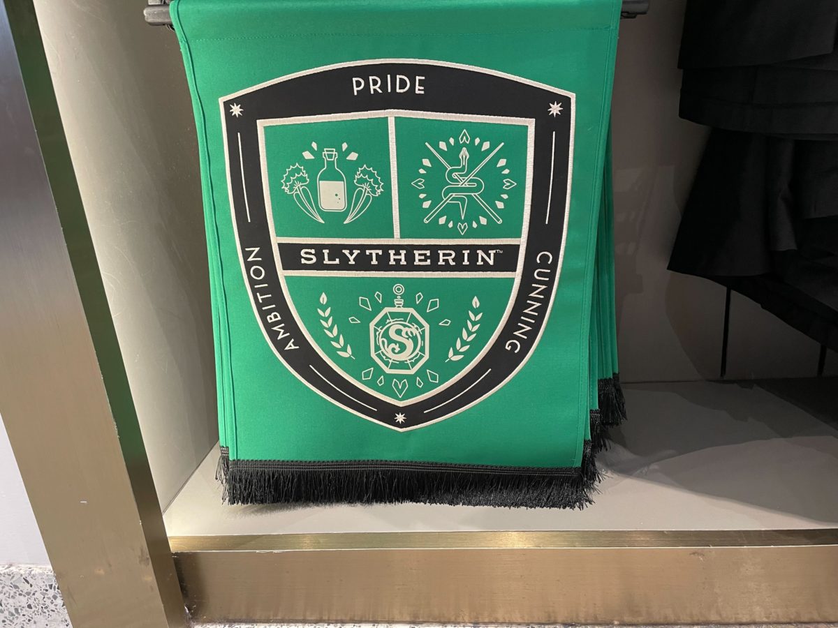 The Slytherin banner is green with a black and grey crest featuring a potion, snake, and Slytherin’s locket. It lists ambition, pride, and cunning.