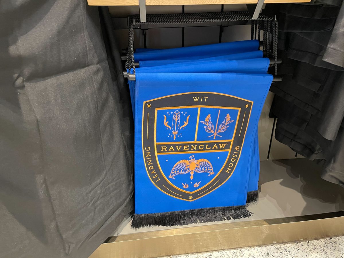 The Ravenclaw banner is blue with a black and gold crest featuring a feather, wand, and Ravenclaw’s diadem. It lists learning, wit, and wisdom.