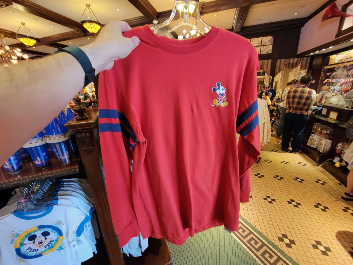 This long-sleeved shirt is red, with blue stripes on the sleeves. Mickey is on the left breast.