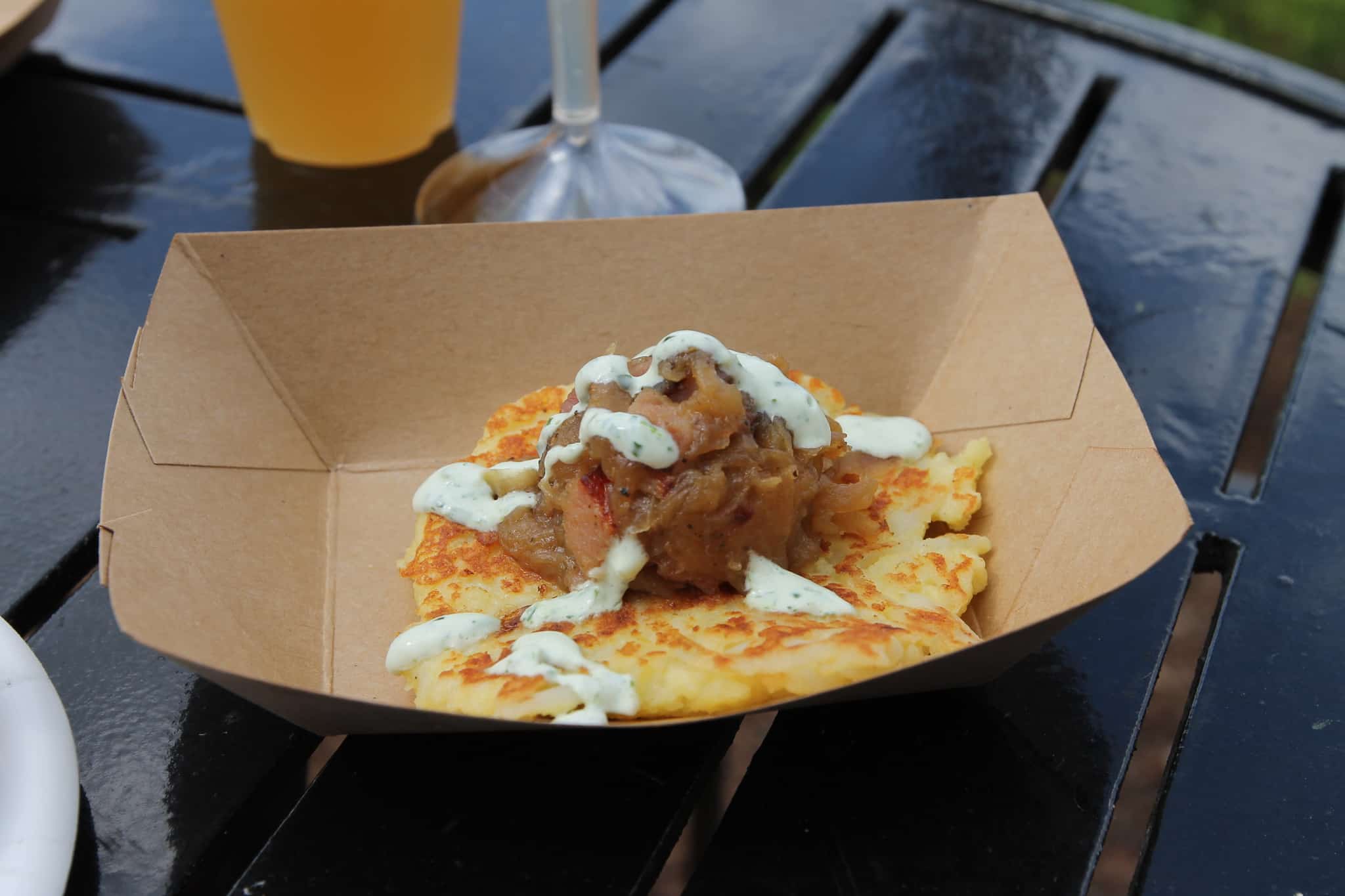 Potato Pancake with Caramelized Ham, Onions and Herb Sour Cream – $5.00