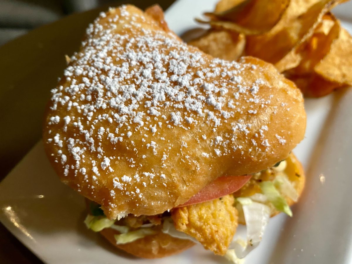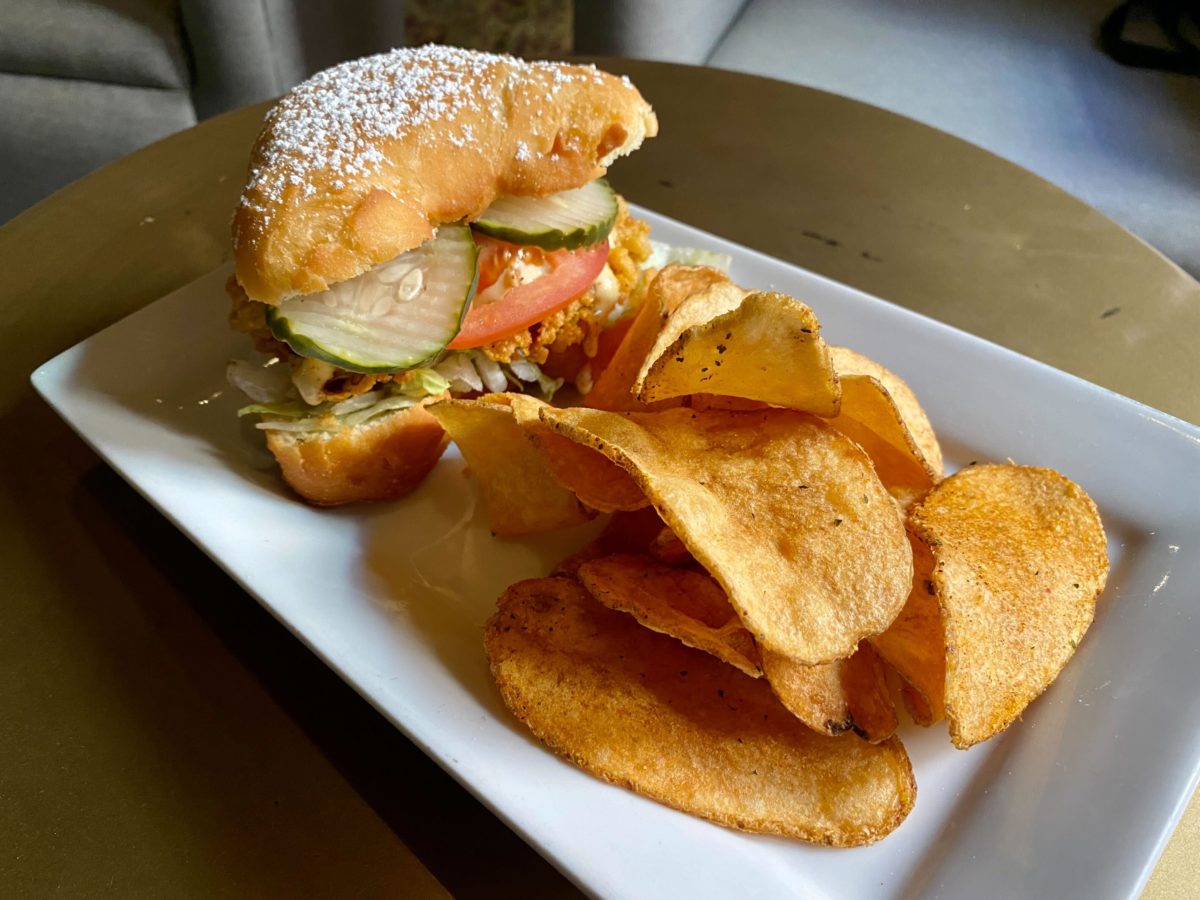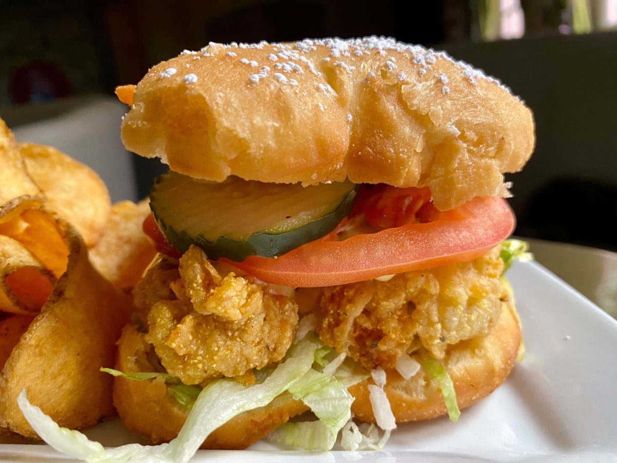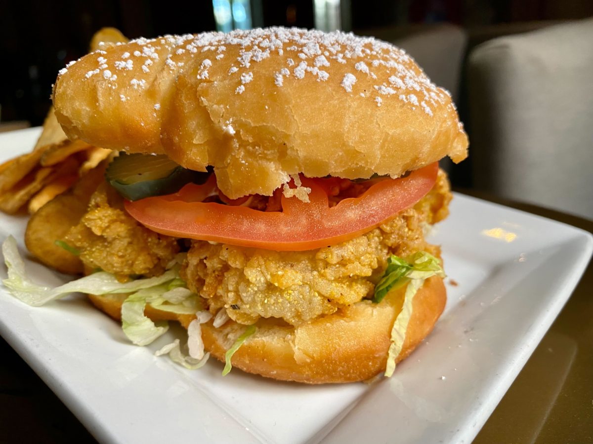 Mickey-shaped Beignet with Fried Oysters, Lettuce, Tomato, Cajun Rémoulade, and House-made Pickles served with Potato Chips