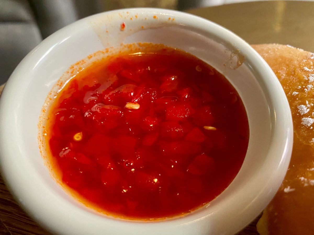 The pepper jelly dip is sweet with the beignet. It’s a good dip, but we think it would work better with something salty (like a chip or cracker) to counter all the sweetness.