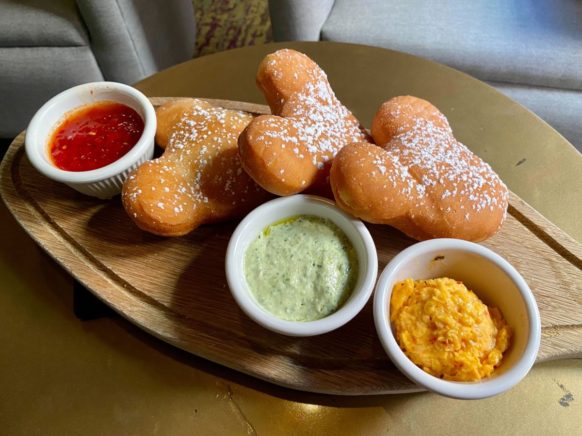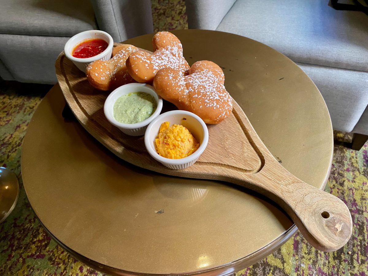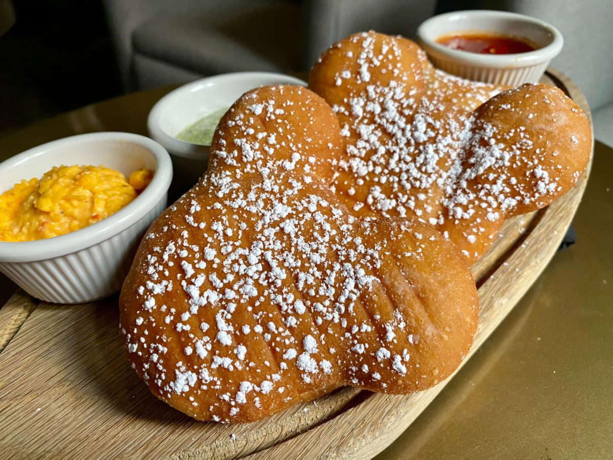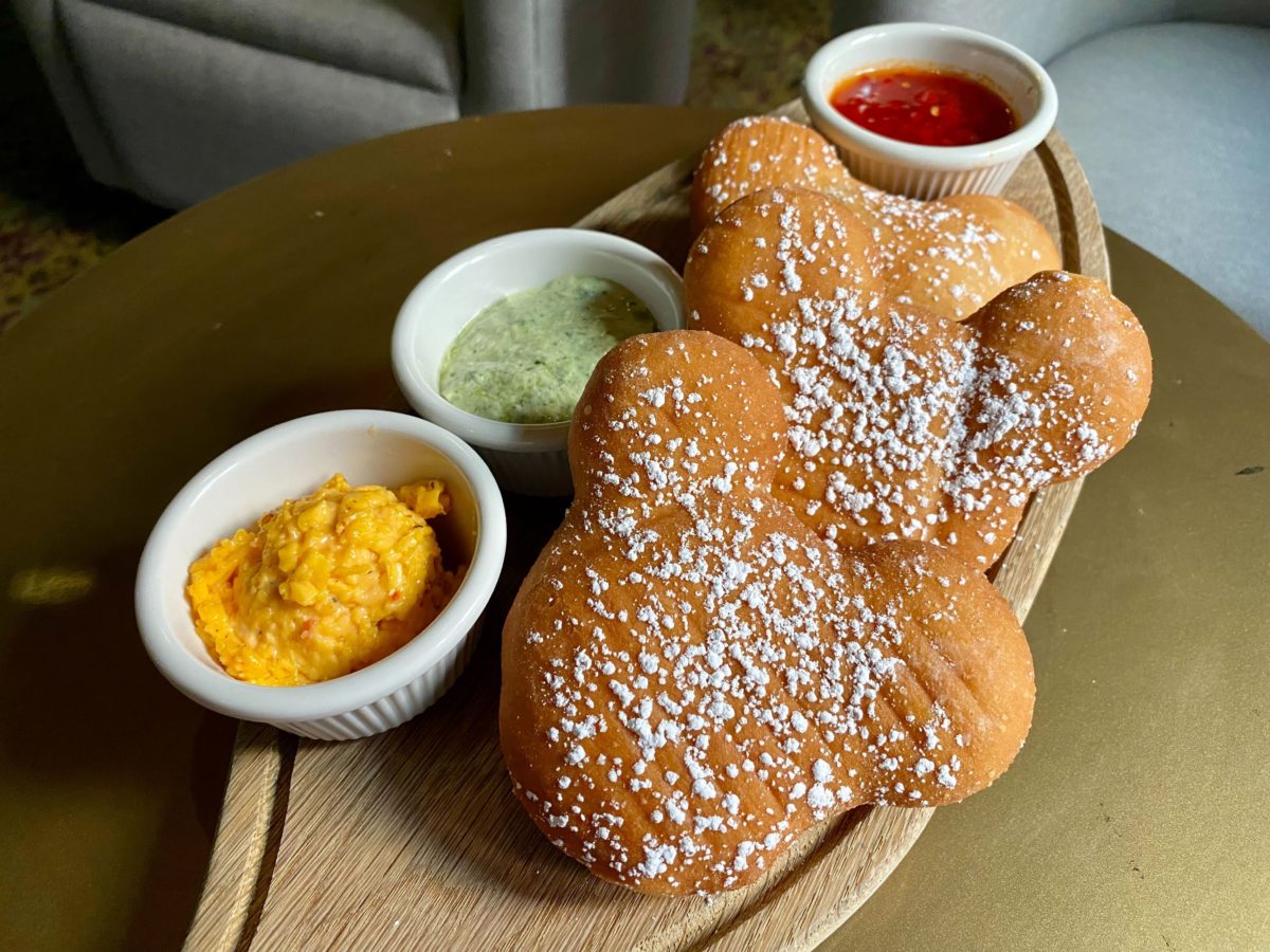 Trio of Mickey-shaped Beignets served with Red Pepper Jelly, Pimento Cheese, Green Goddess Dressing, and Dusted with Powdered Sugar