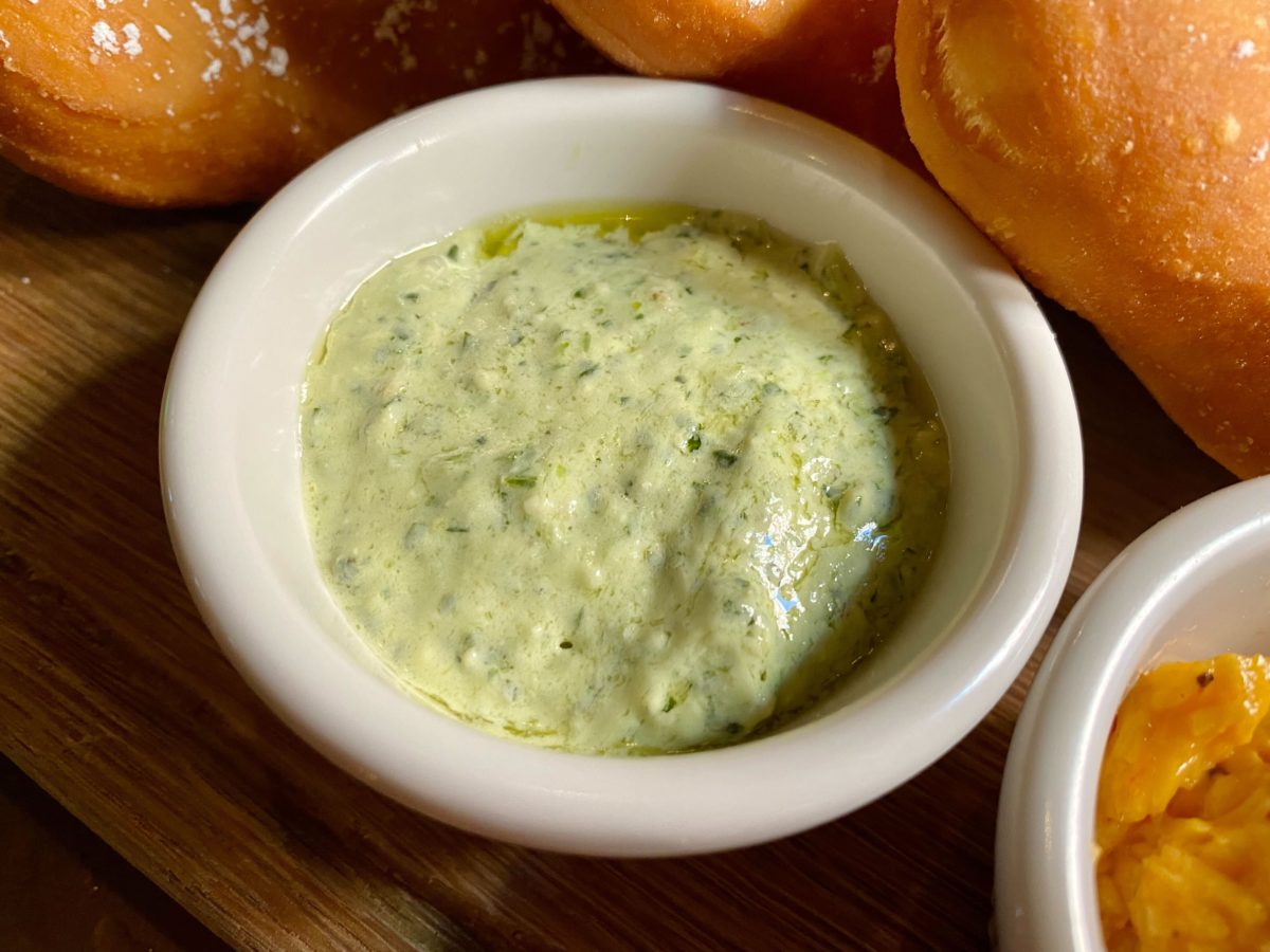 The pimento dip was harder to physically dip the beignet into, but it’s a good saltier cheesy dip.