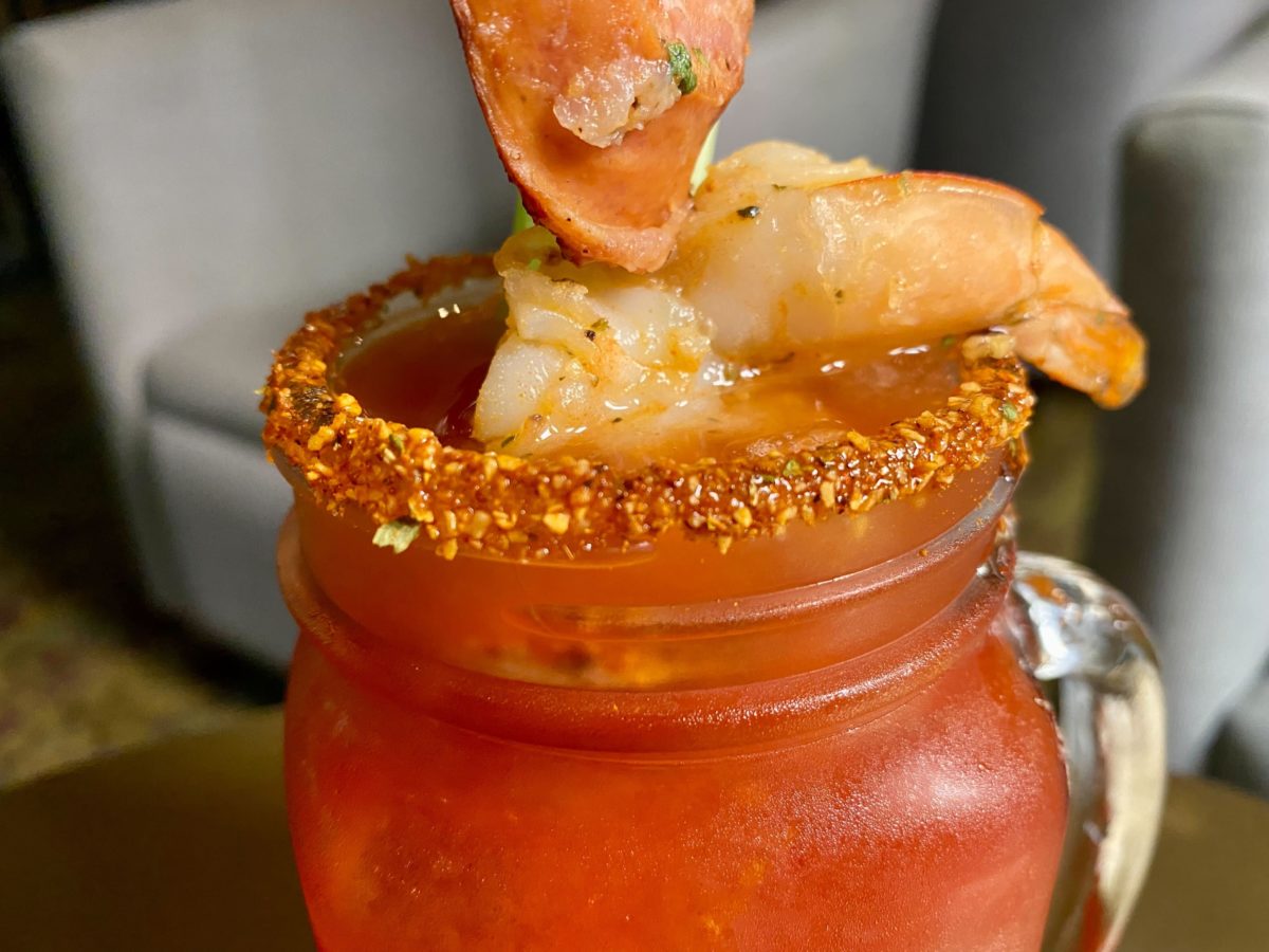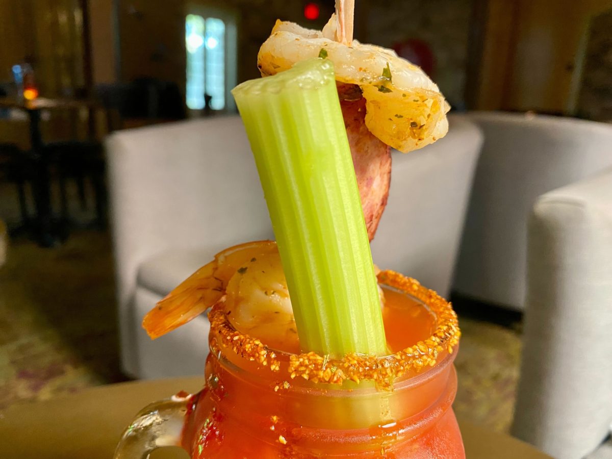 Absolut Vodka, Spicy Bloody Mary Mix, Shrimp, Andouille Sausage, and Celery