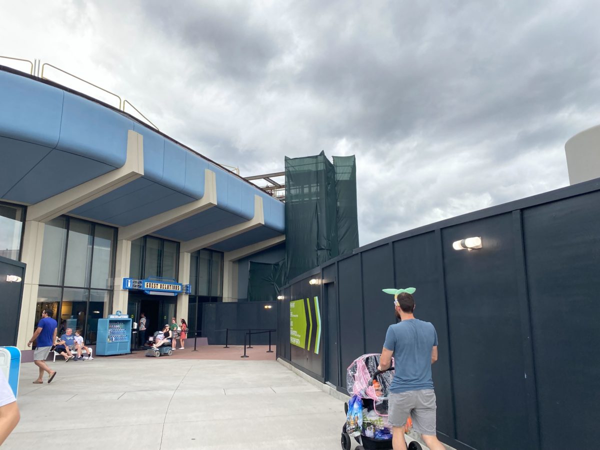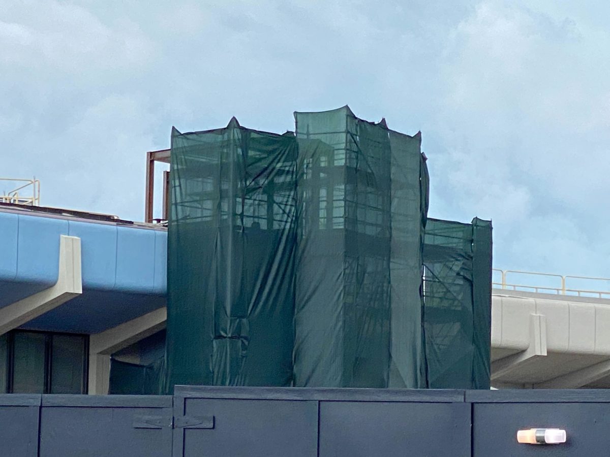 Scaffolding and Scrim Surround Exposed Steel Near Guest Relations at EPCOT