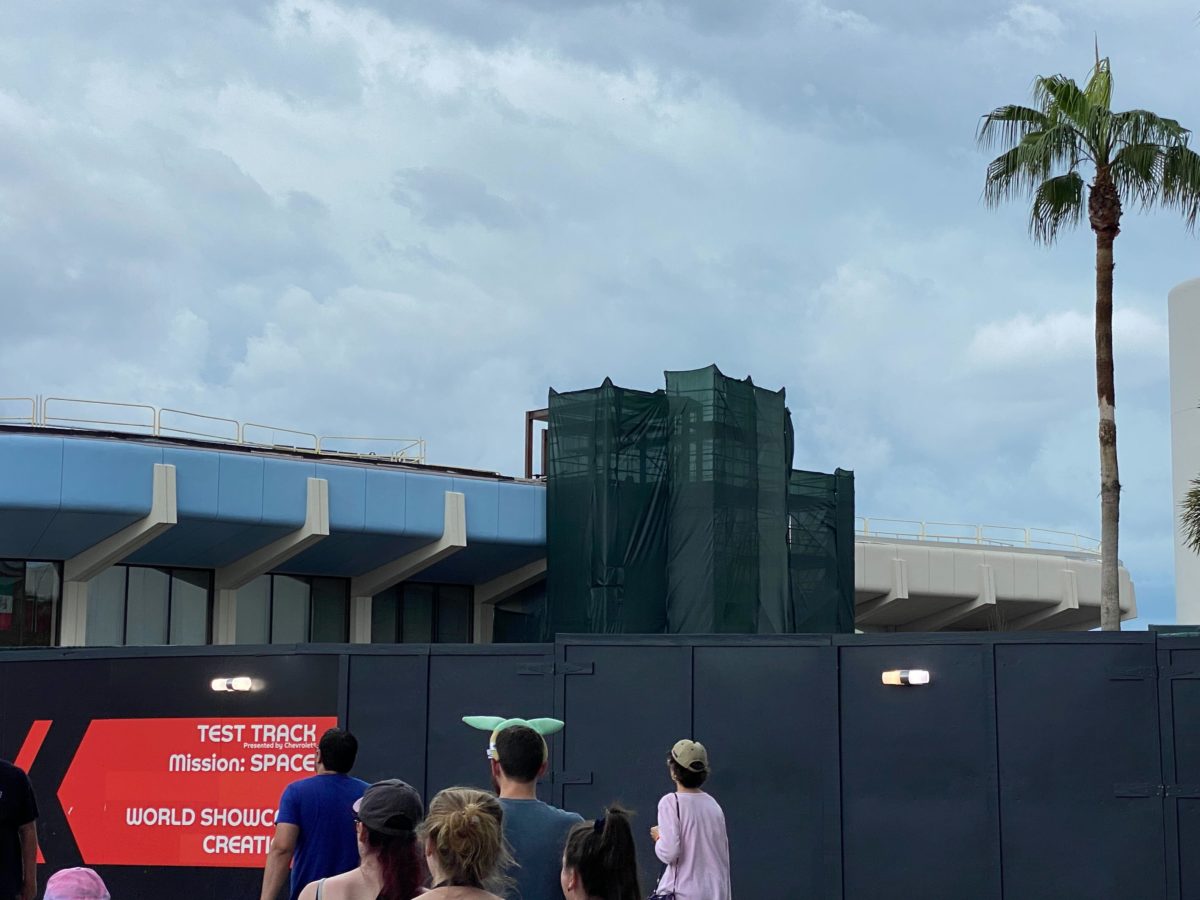 The exposed steel tower outside Connections Café and Eatery, near Guest Relations, at EPCOT has now been covered by scaffolding and green scrim.
