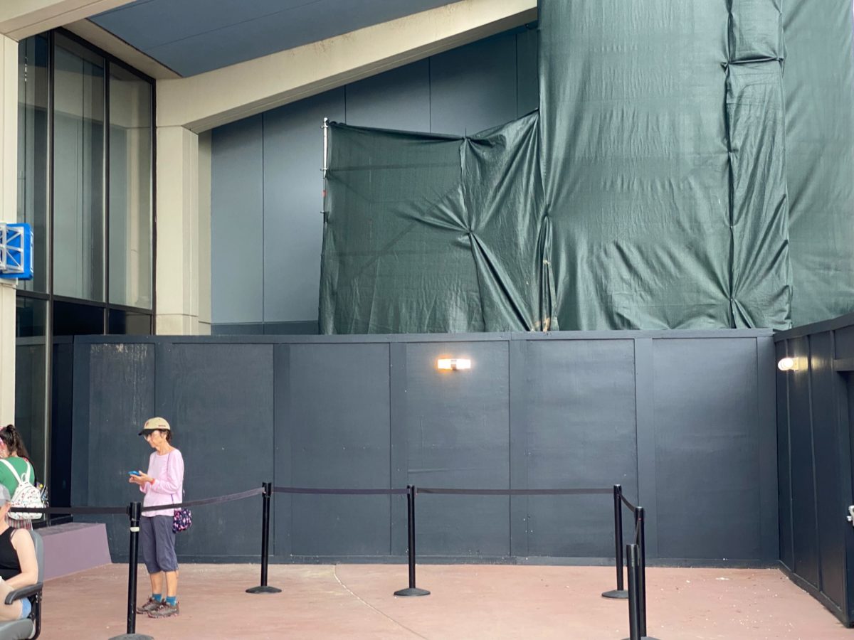 The scrim and scaffolding also extend around the corner towards Guest Relations.