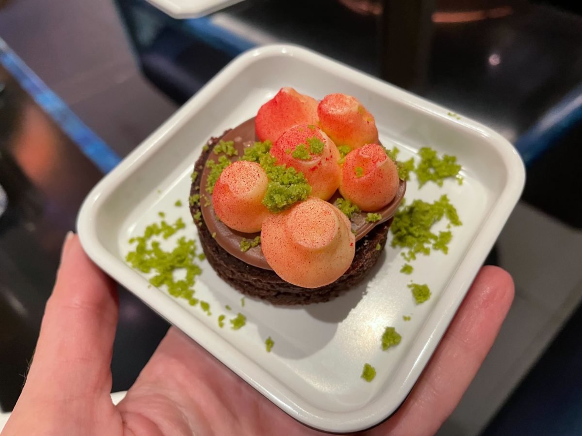 This is a brownie with salted caramel and dollops of a not-very-sweet mascarpone whipped cheesecake. The brownie was fine, but combined with the salted caramel, it’s quite good. The mascarpone dollops don’t add much, and they sprinkle this green topping over everything and pretend that makes it space-like.