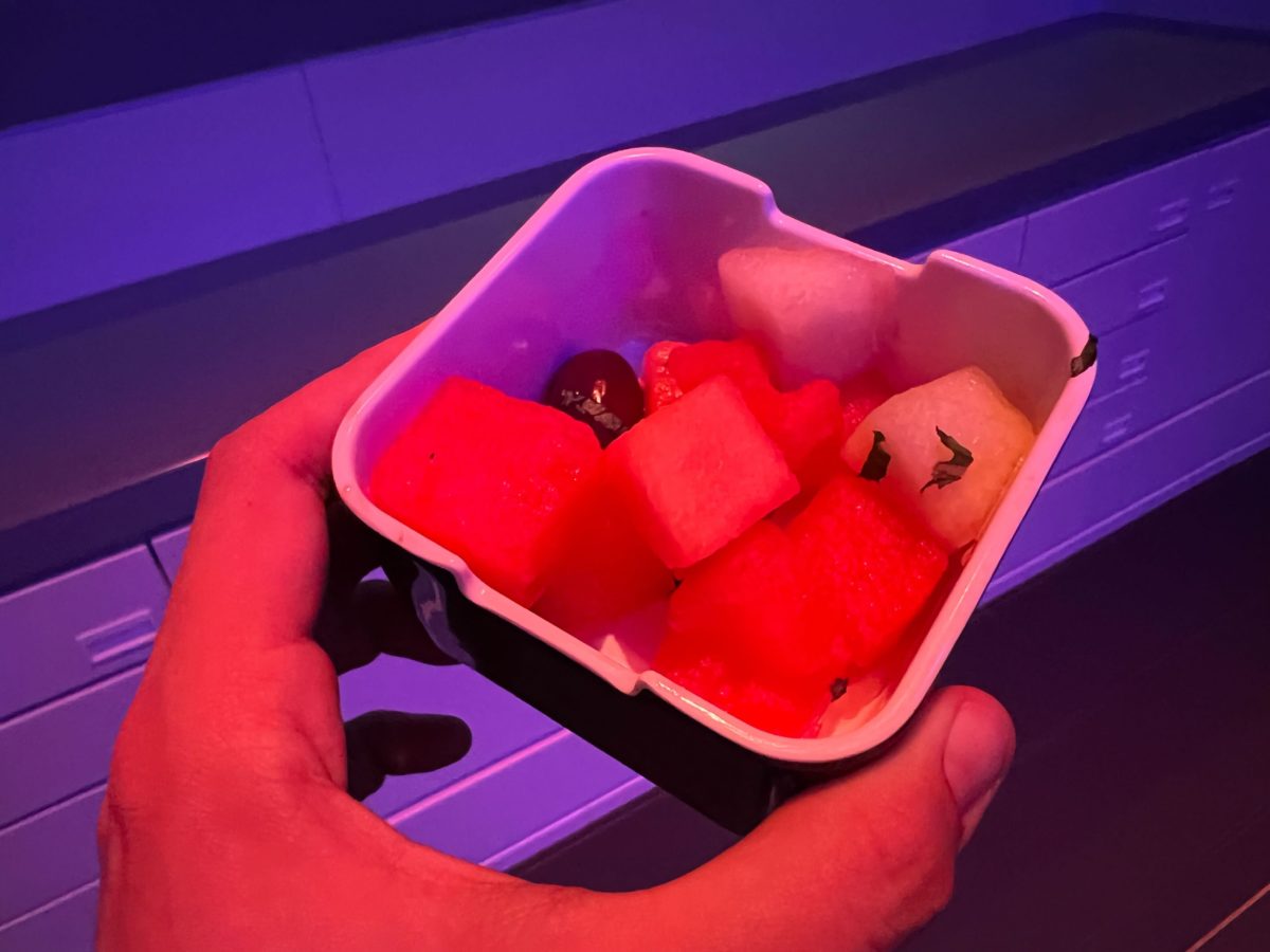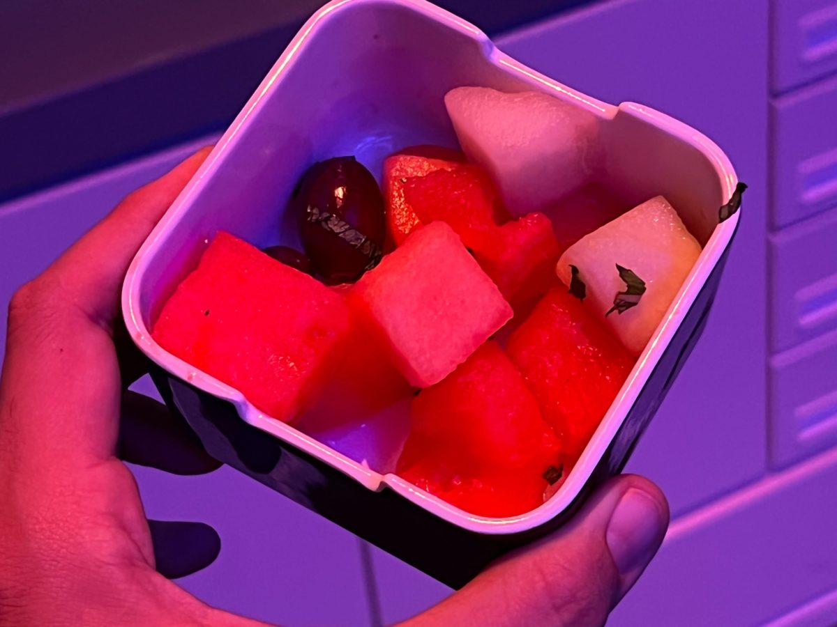 This is an obvious attempt to make something look vaguely space-themed. The watermelon had a weird, minty taste. The other fruits were not sweet, but we wouldn’t expect them to be in March.