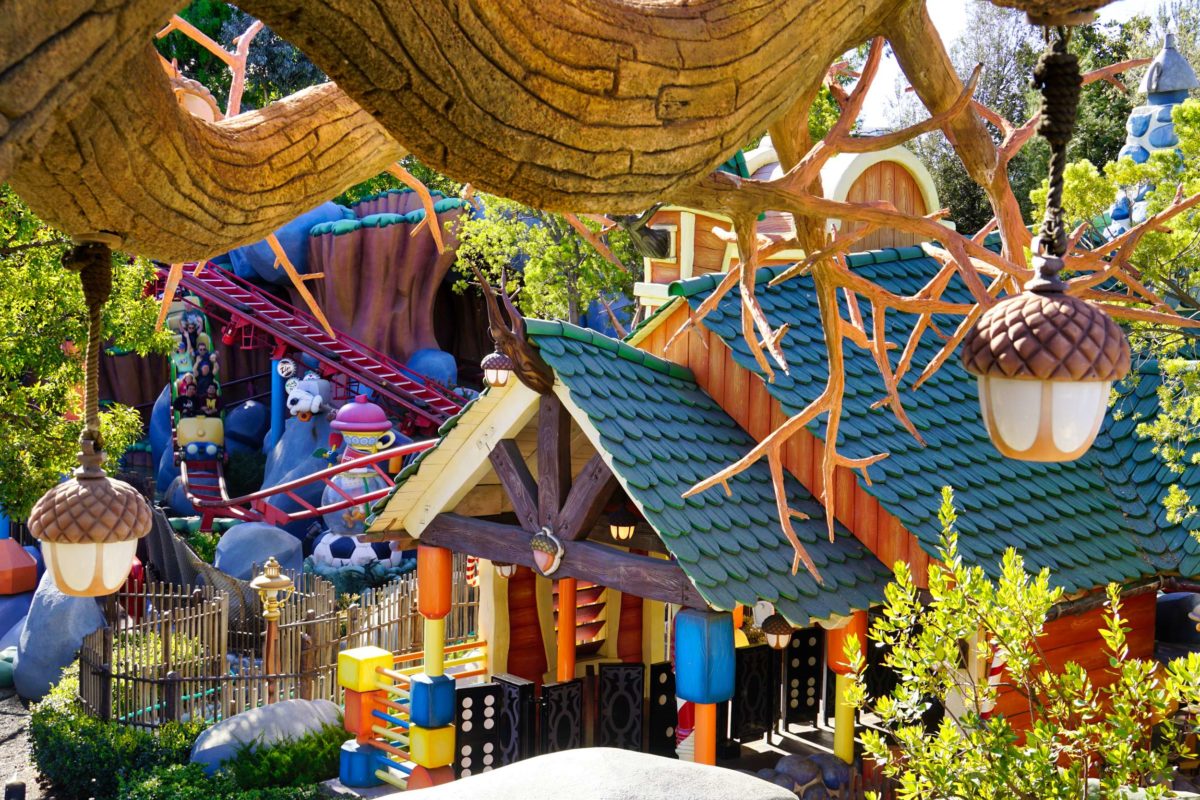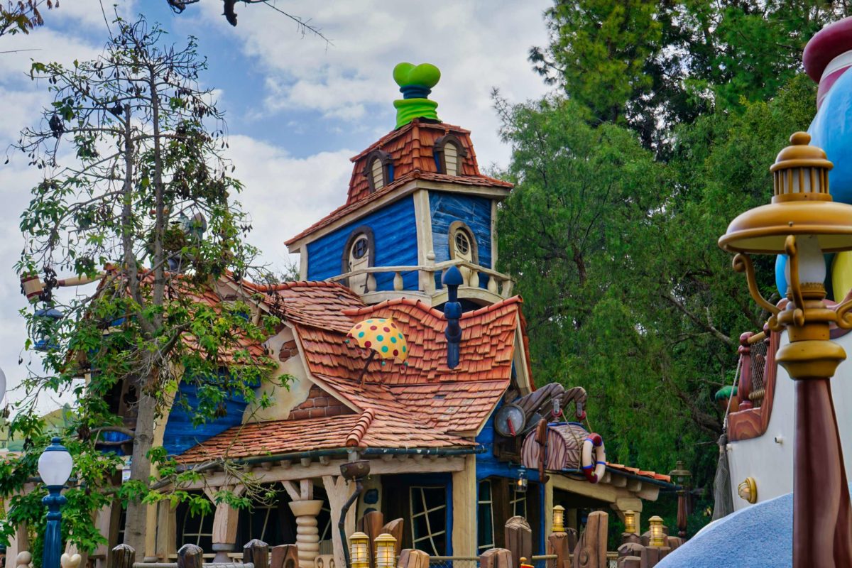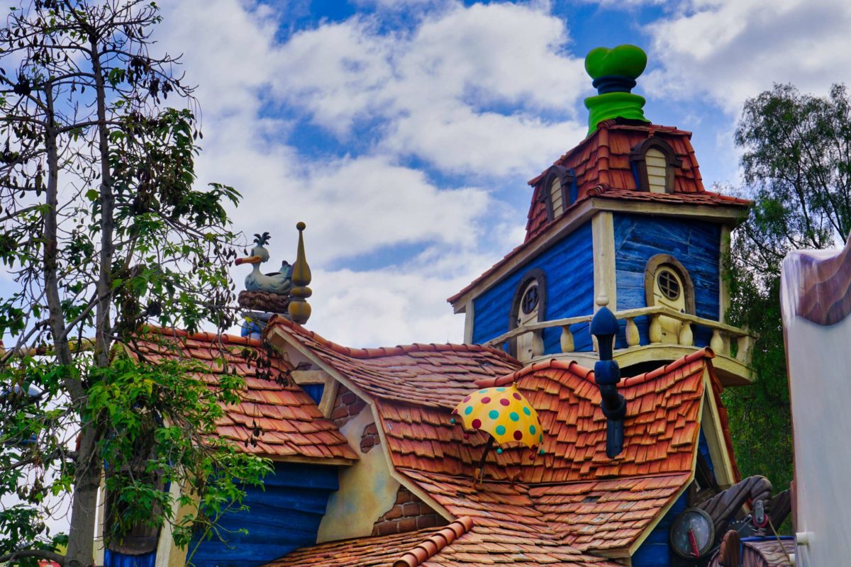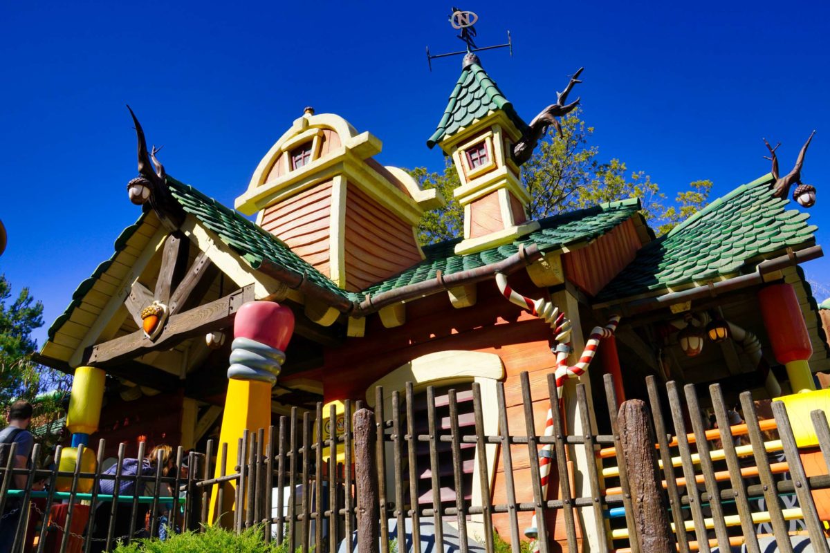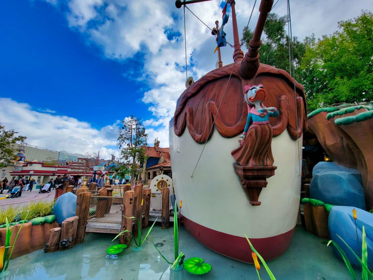 Goofy’s Playhouse, Donald’s Boat, Gadget’s Go Coaster, and Chip ‘n Dale’s Treehouse all circle the courtyard of Mickey’s Neighborhood.