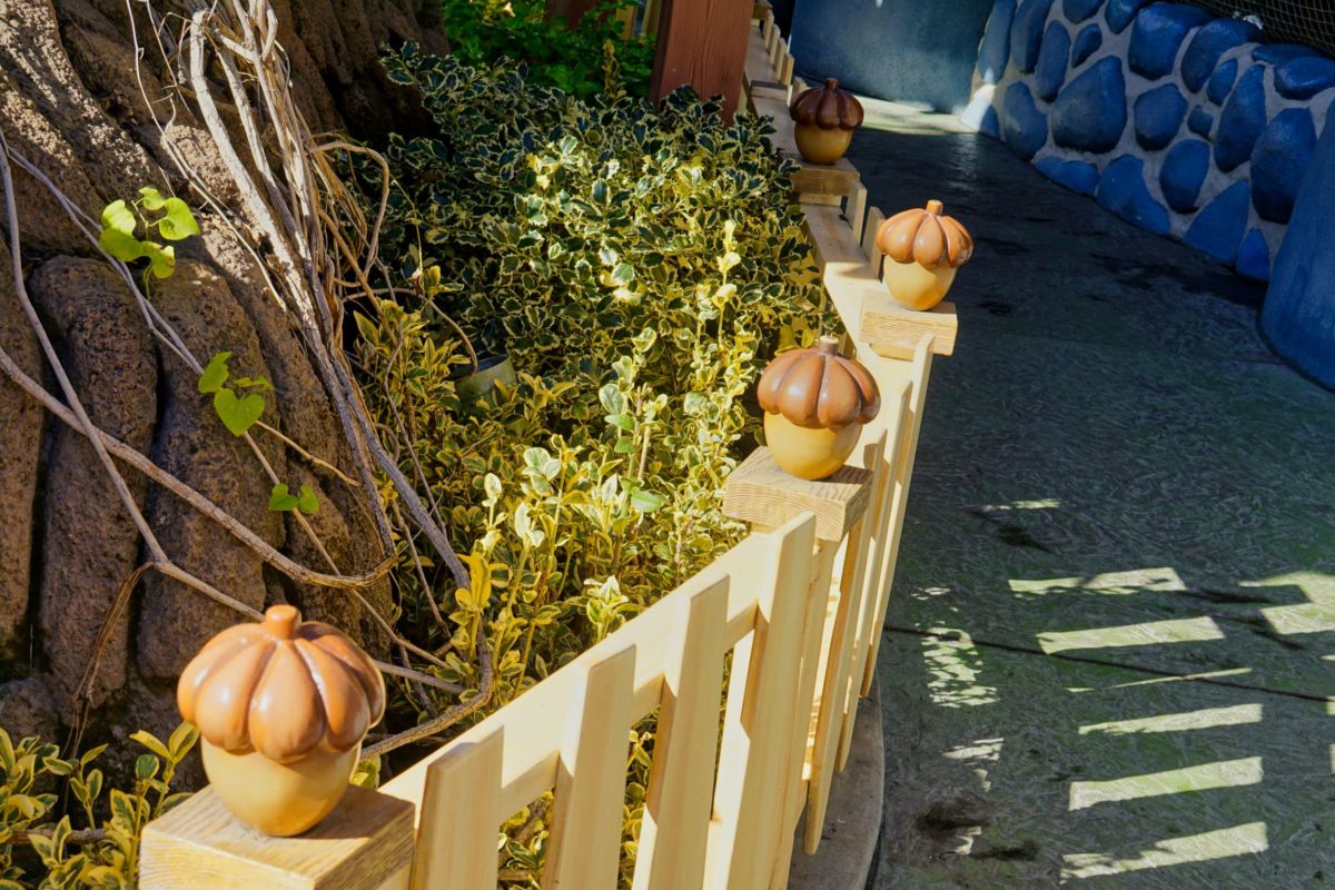 Acorns decorate the fence around the treehouse.