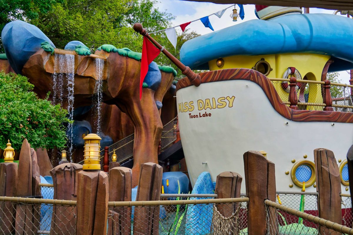 Donald’s Boat is docked in Toon Lake next to Goofy’s Playhouse.