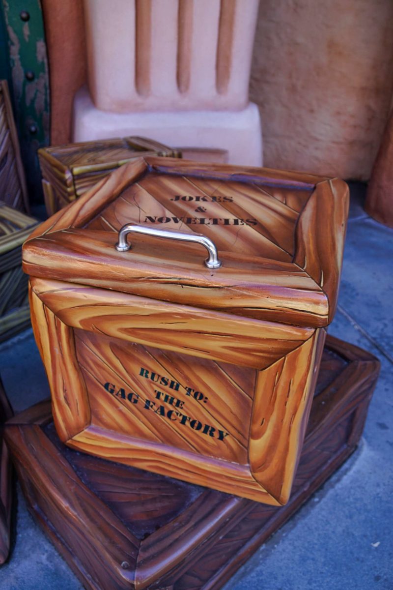 In front of the Gag Warehouse are crates.