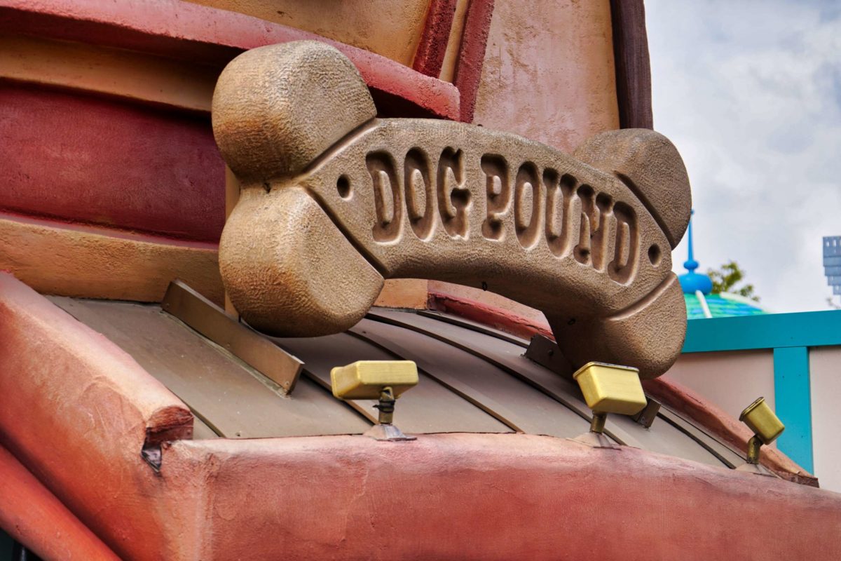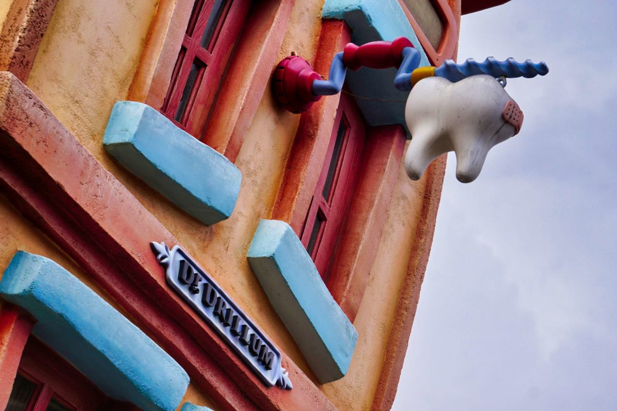 Above the Dog Pound is a sign for Dr. Drillum, with a tooth hanging from a drill.