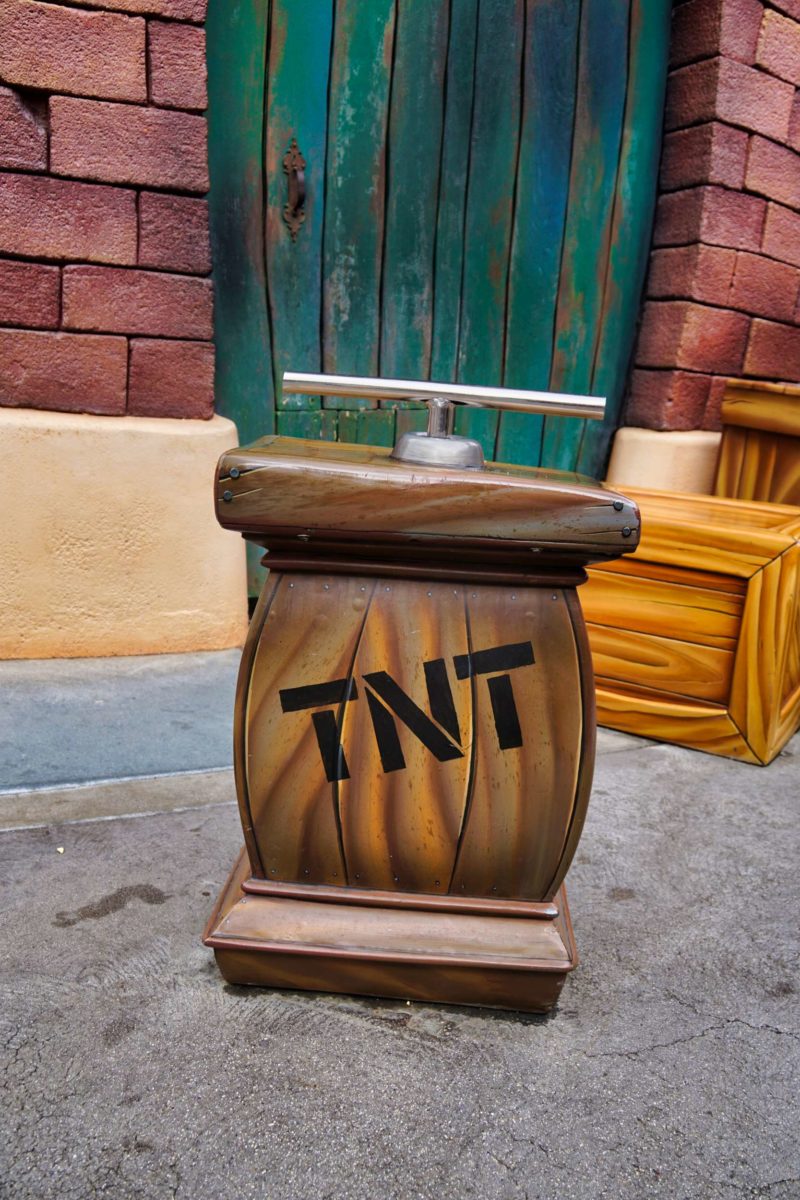 Guests can use the bar on this TNT box to cause their own explosion in the upper windows of the factory.