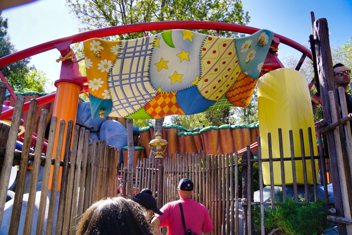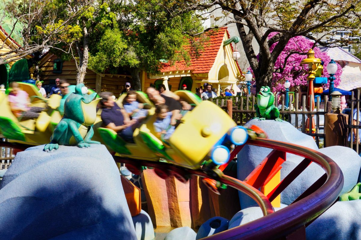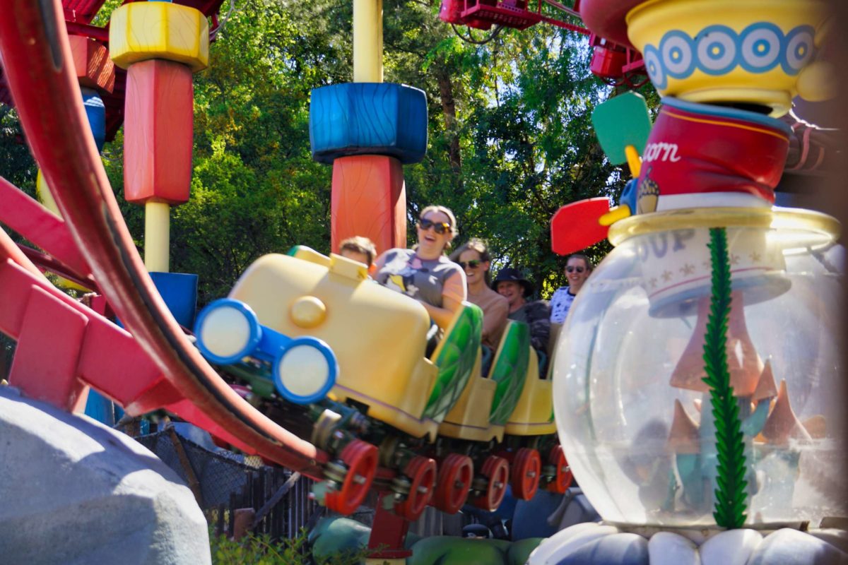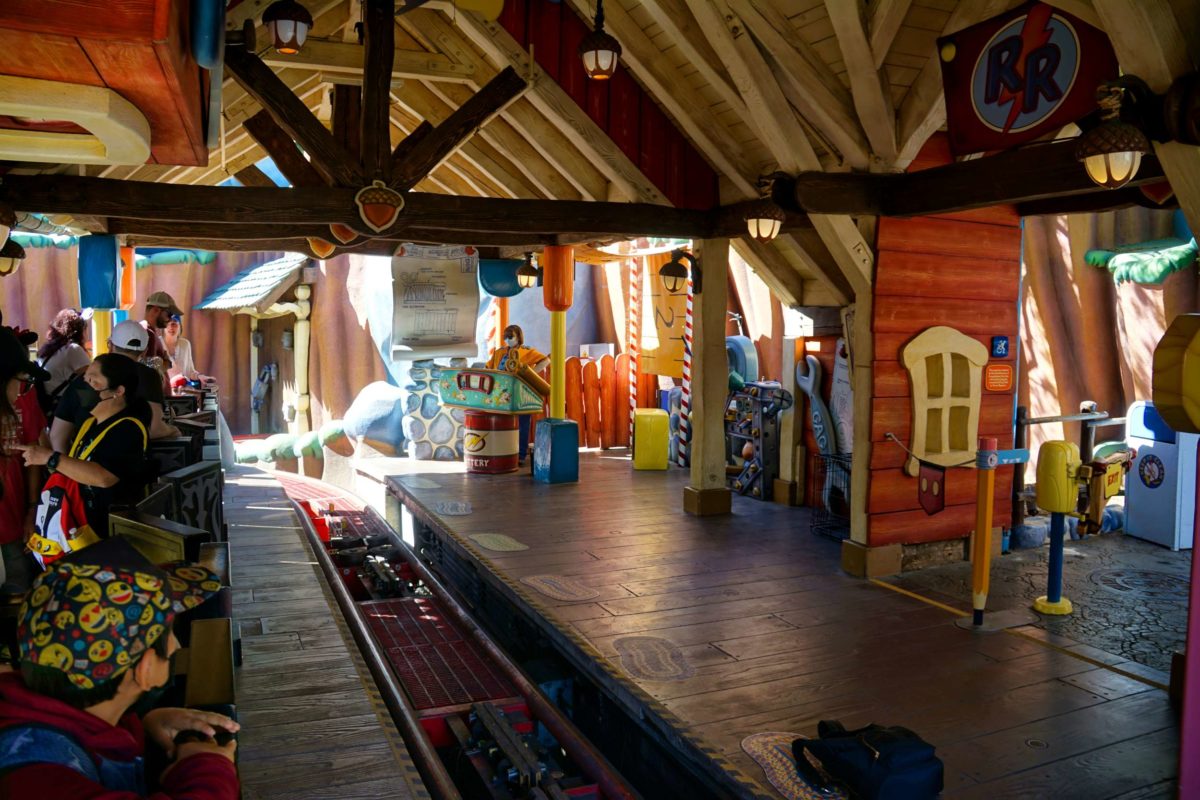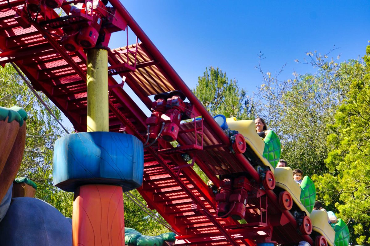 The coaster starts with a lift hill up that gives guests a good view of Mickey’s Toontown.