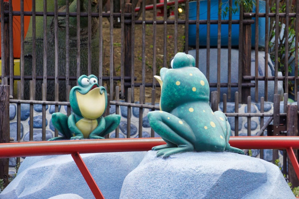 There are frogs on rocks surrounding the coaster.