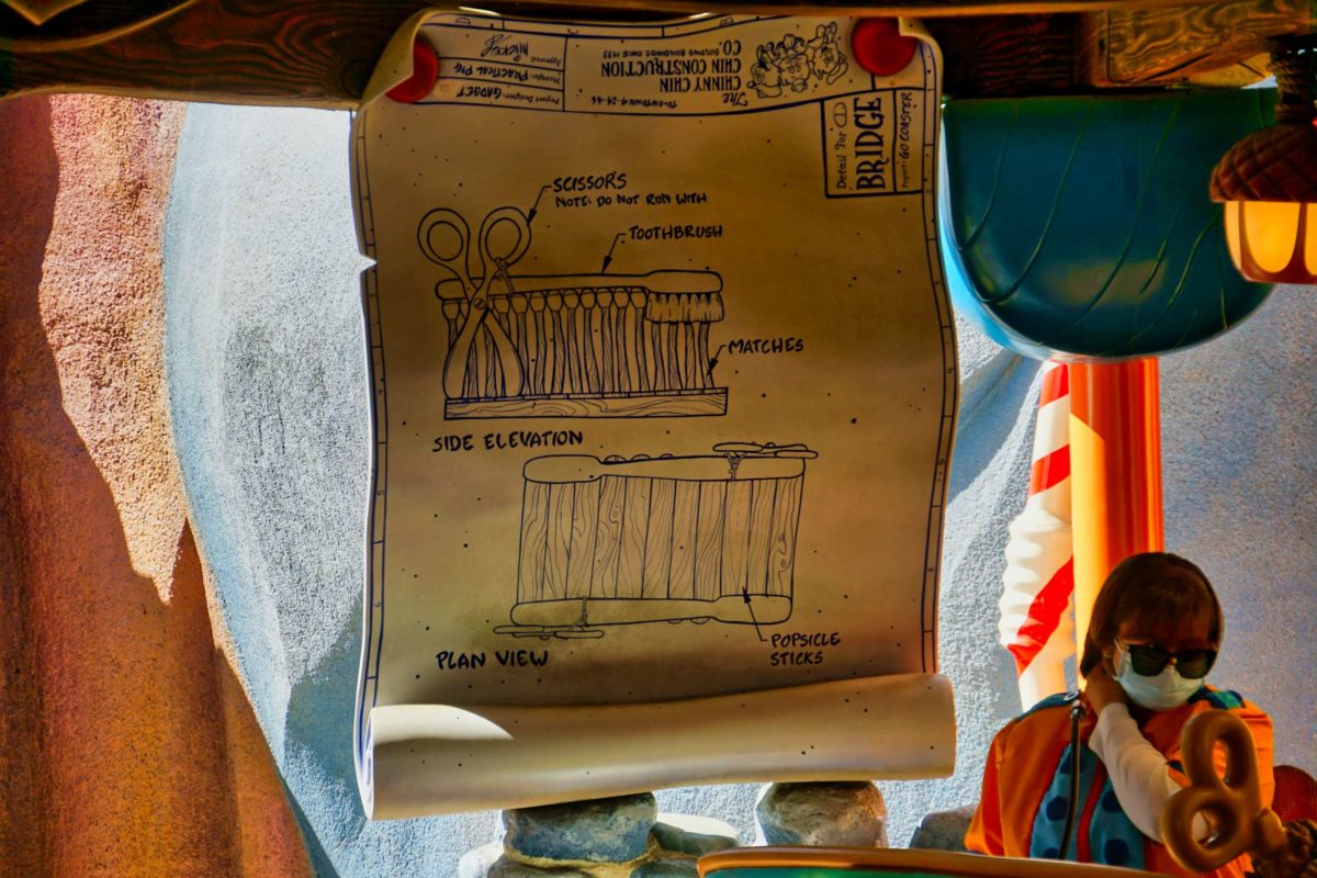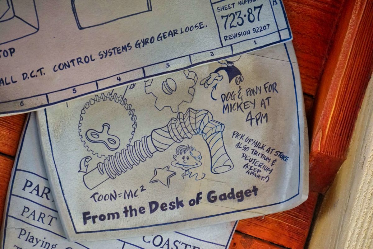 The loading area is full of more giant props and some of Gadget’s plans.