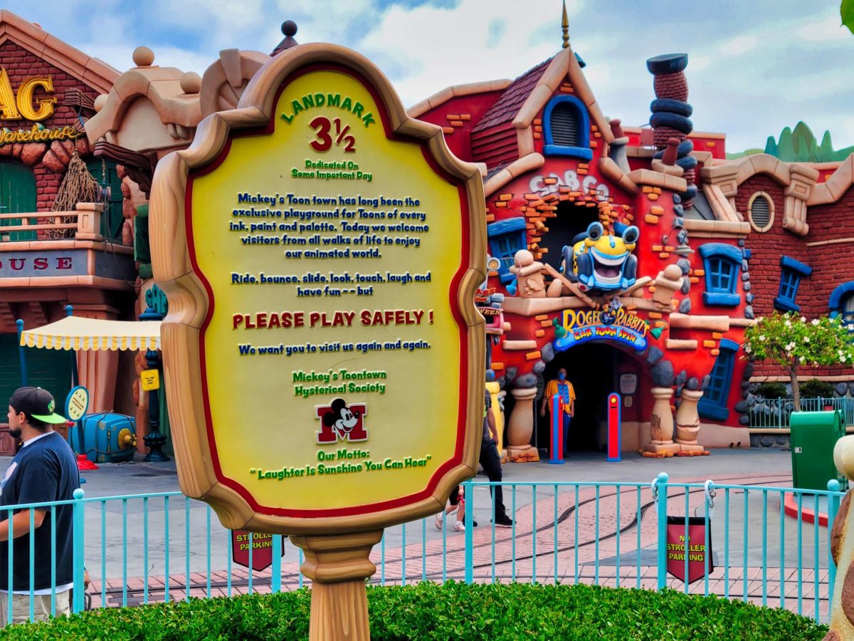 This sign for Landmark 3 1/2 was dedicated on “some important day.” It reads “Mickey’s Toontown has long been the exclusive playground for Toons of every ink, paint and palette. Today we welcome visitors from all walks of life to enjoy our animated world. Ride, bounce, slide, look, touch, laugh and have fun — but PLEASE PLAY SAFELY! We want you to visit us again and again.”