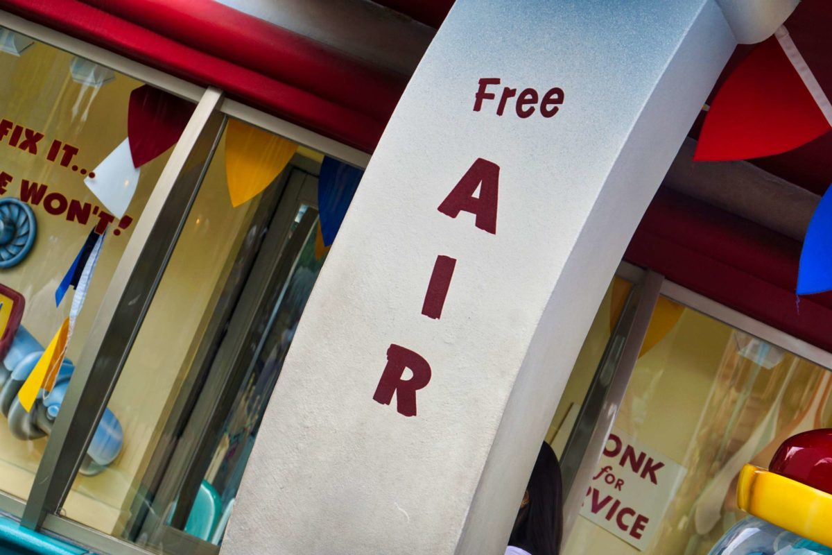 The columns of the gas station advertise “free air.”