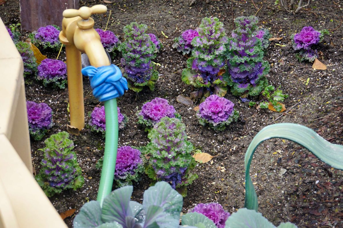 There is a tunnel and slide made of crates for different plants.