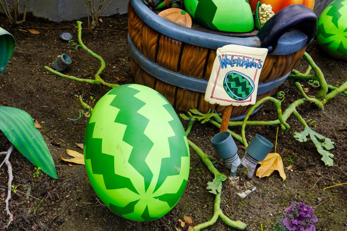 He has watermelons, corn, and pumpkins growing.