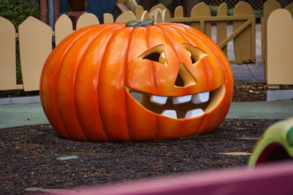 A Jack-o’-lantern smiles on the edge of the garden.