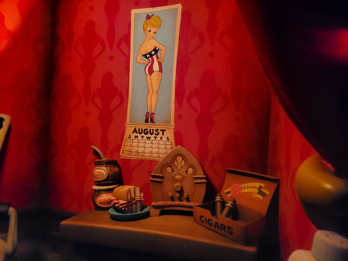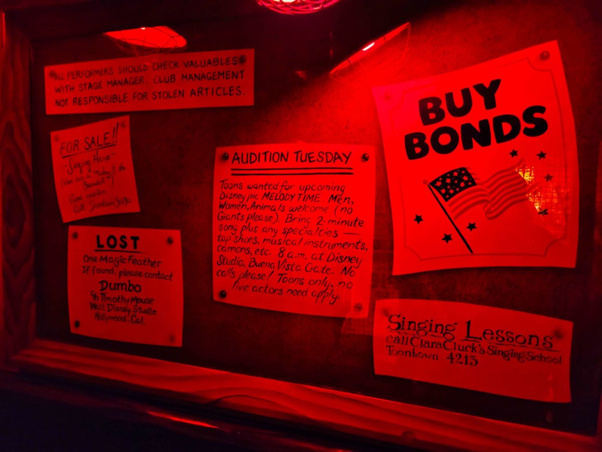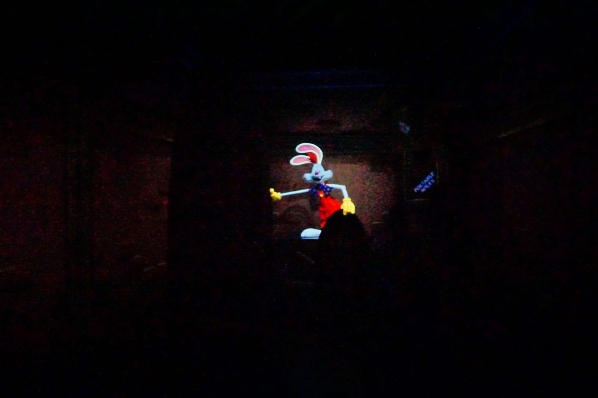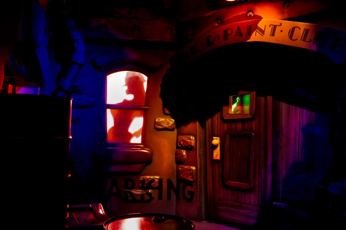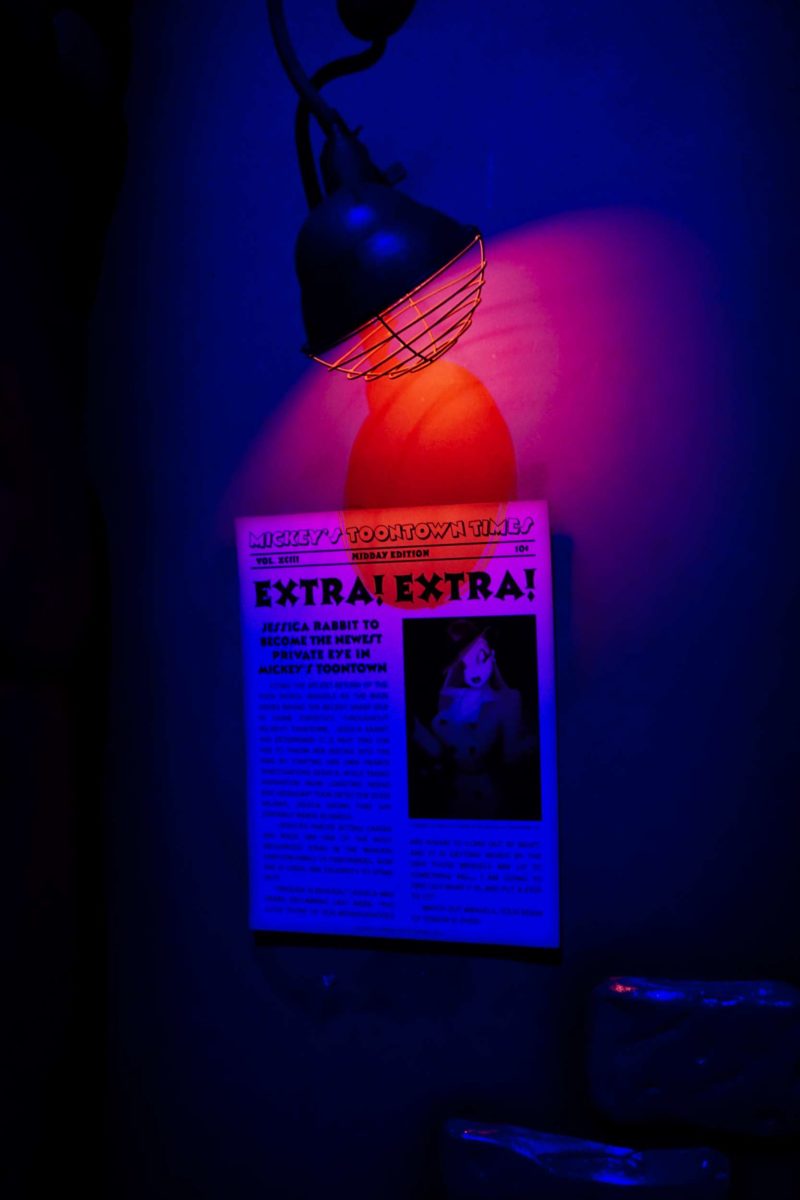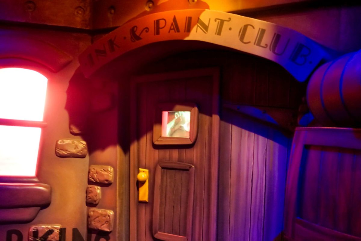 Jessica Rabbit’s detective silhouette walks by a window outside the Ink & Paint Club.