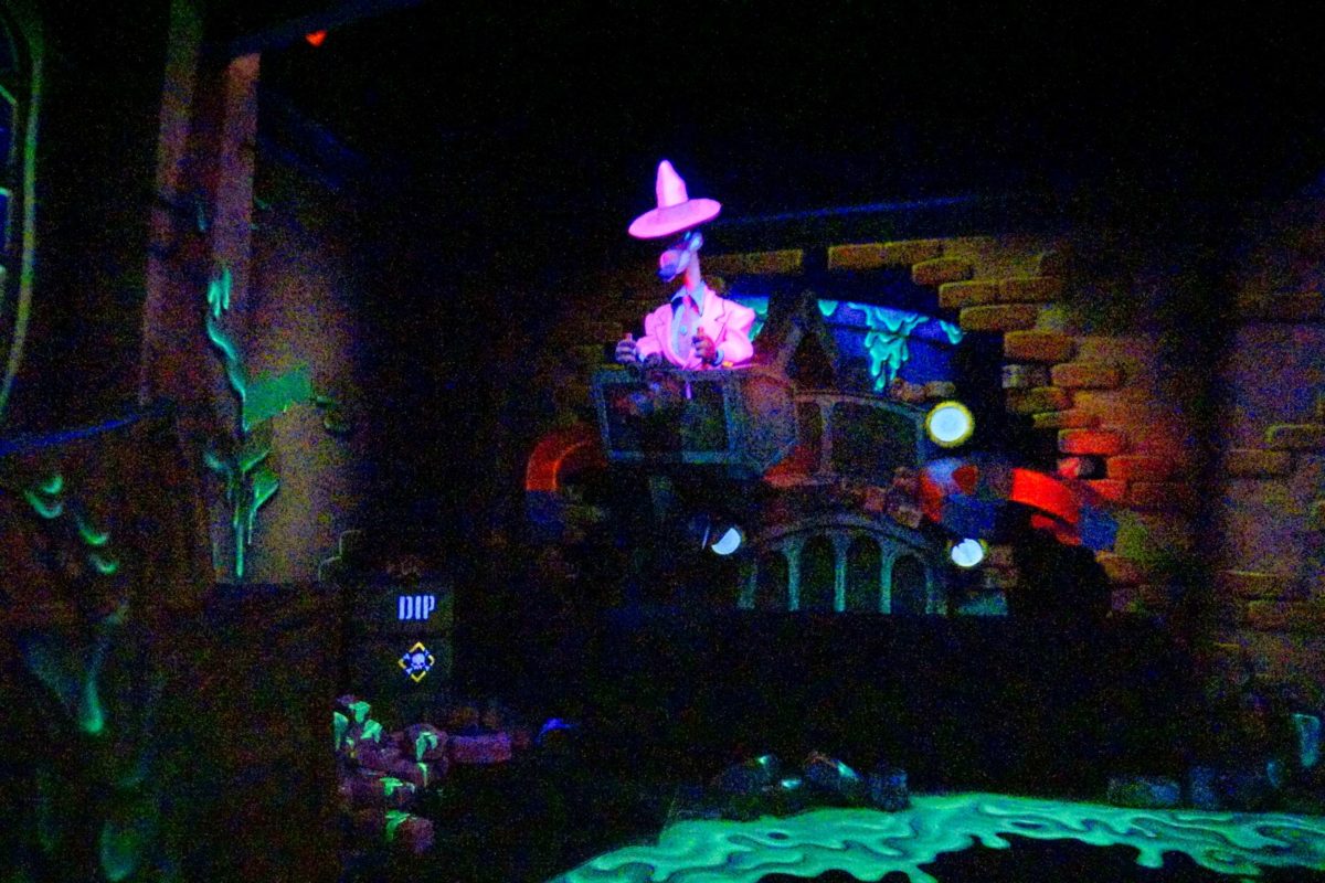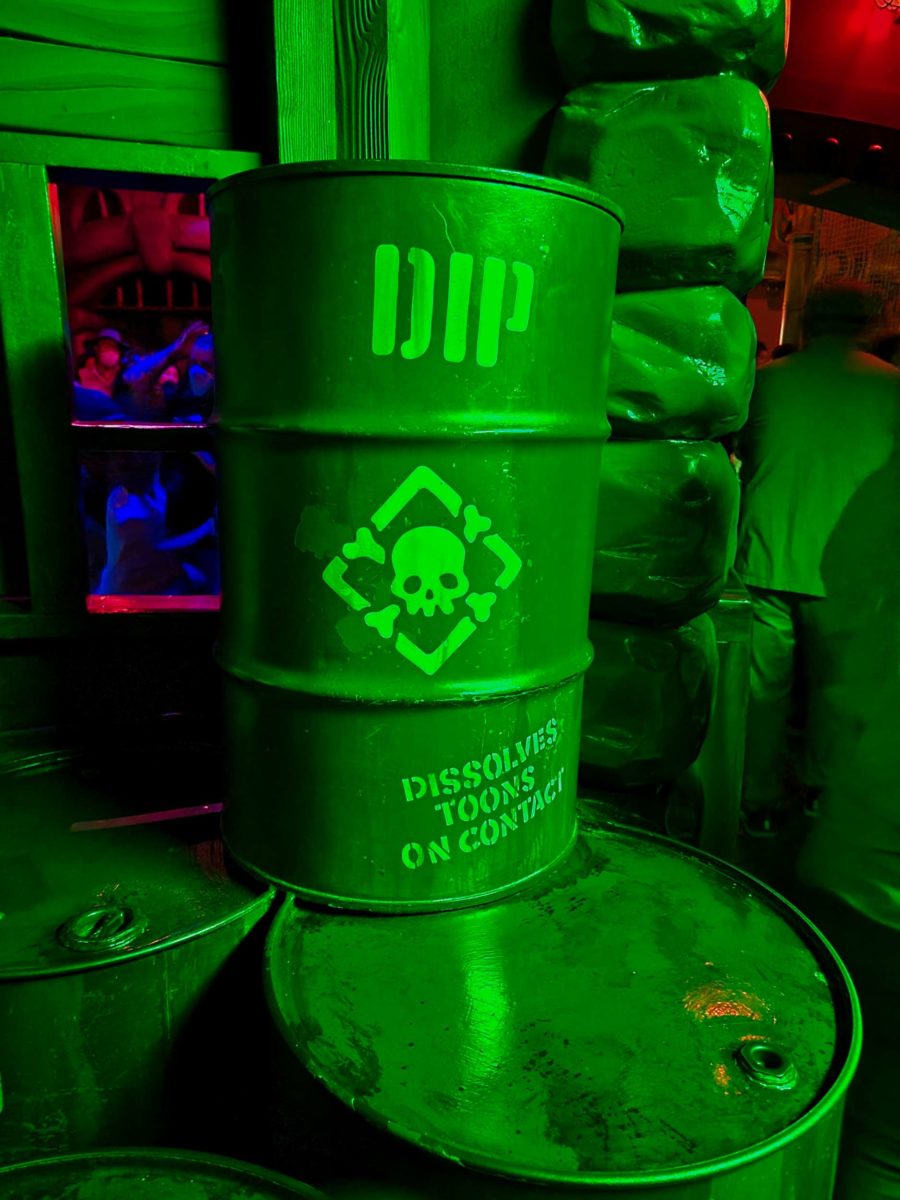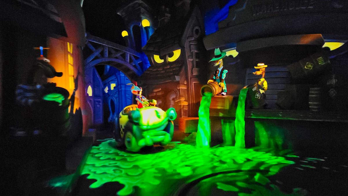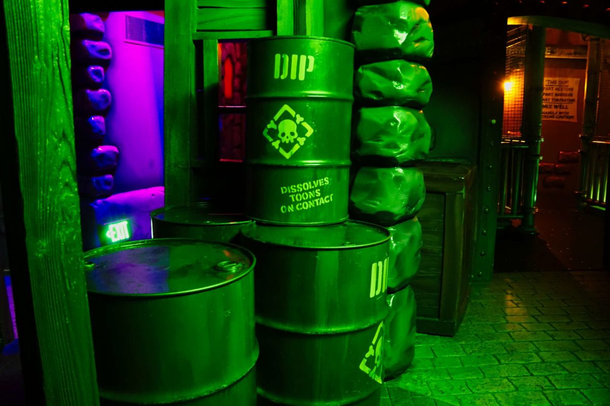 On the ride, guests immediately encounter Roger in Benny the Cab, spinning in Dip poured by the weasels.