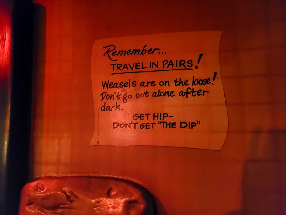 A sign warns guests to travel in pairs because weasels are on the loose.
